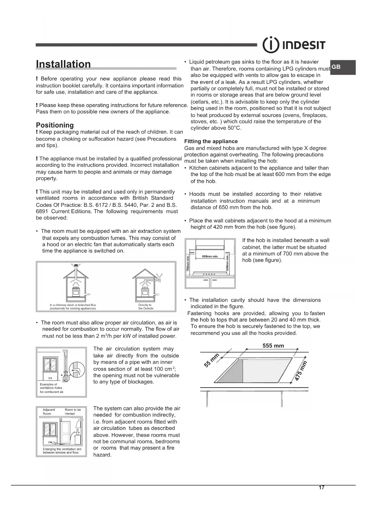 time the appliance is switched on. In a chimney stack or branched flue. (exclusively for cooking appliances)Directly to the Outside • The room must also allow proper air circulation, as air is