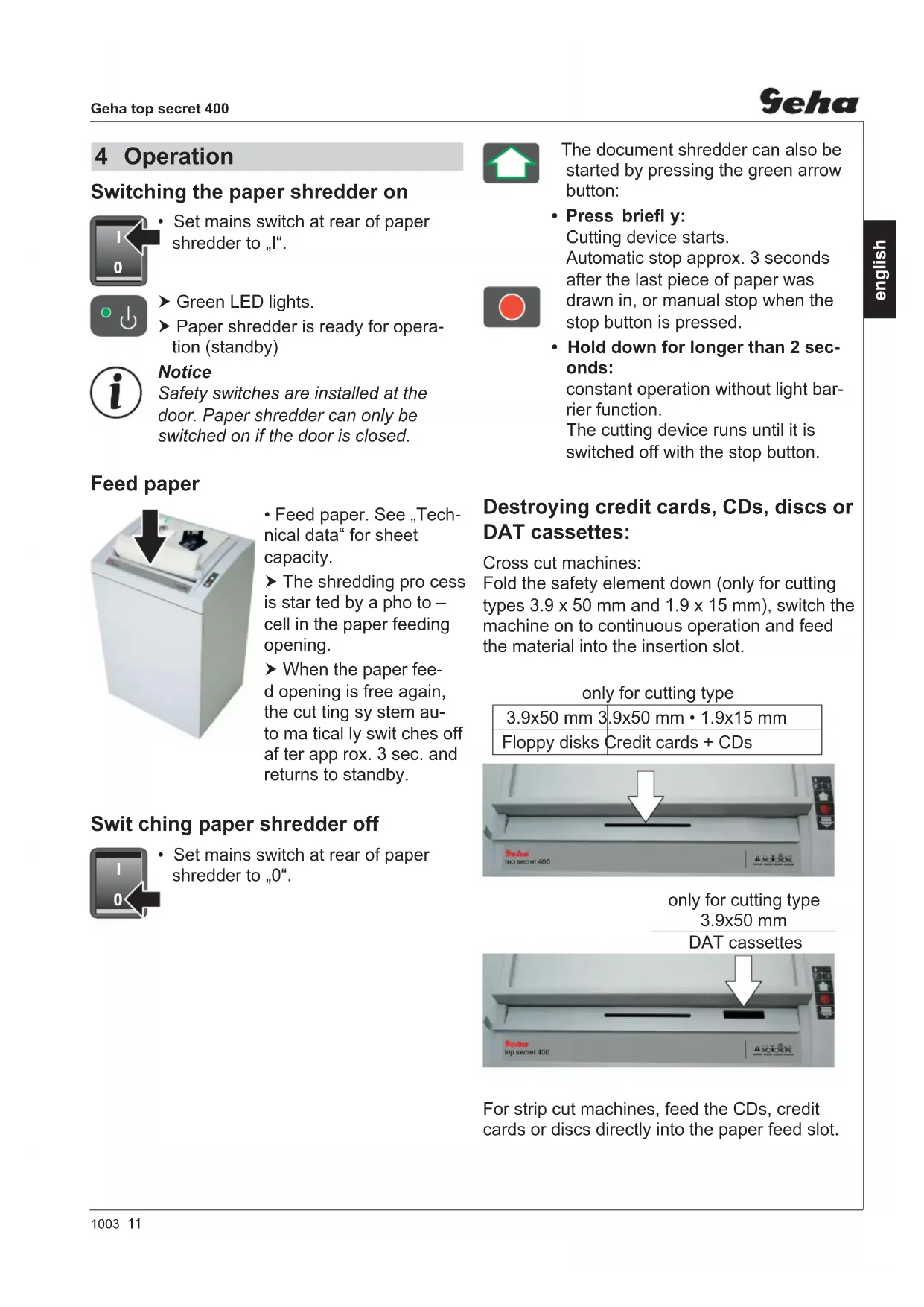 - Hold down for longer than 2 sec- onds: constant operation without light bar- rier function. The cutting device runs until it is switched off with the stop button. Destroying credit cards, CDs, discs or DAT cassettes: Cross cut machines: Fold the safety element down (only for cutting types 3.9 x 50 mm and 1.9 x 15 mm), switch the machine on to continuous operation and feed the material into the insertion slot. only for cutting type 3.9x50 mm DAT cassettes For strip cut machines, feed the CDs, credit cards or discs directly into the paper feed slot. only for cutting type 3.9x50 mm 3.9x50 mm • 1.9x15 mm Floppy disks Credit cards + CDs 4 Operation12 1003 Geha top secret 400 english Pa per jam You have fed in too much paper. Paper shredder jammed. Red LED in the key pad fl ashes. Paper shredder reverses automati- cally. Notice! Do not press dashed arrow button and green arrow button alternately for- wards and backwards. Cutting unit can be damaged.