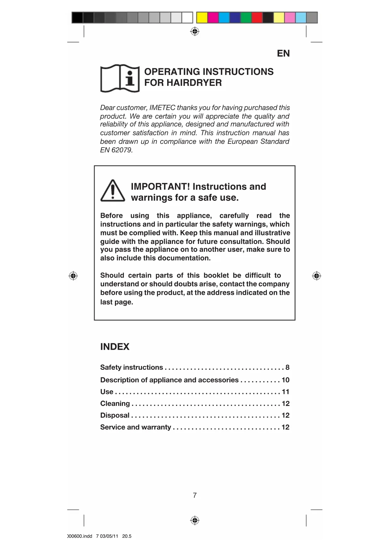 OPERATING INSTRUCTIONS FOR HAIRDRYER Dear customer, IMETEC thanks you for having purchased this