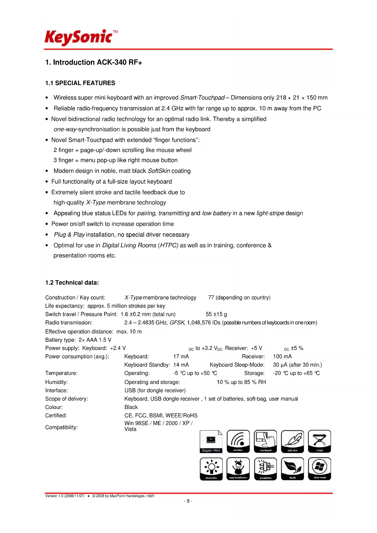 ±5 % Power consumption (avg.): Keyboard: 17 mA Receiver: 100 mA Keyboard Standby: 14 mA Keyboard Sleep-Mode: 30 µA (after 30 min.) Temperature: Operating: -5 °C up to +50 °C Storage: -20 °C up to +65 °C Humidity: Operating and storage: 10 % up to 85 % RH Interface: USB (for dongle receiver) Scope of delivery: Keyboard, USB dongle receiver , 1 set of batteries, soft-bag, user manual Colour: Black Certified: CE, FCC, BSMI, WEEE/RoHS Compatibility: Win 98SE / ME / 2000 / XP / VistaOperation Manual ACK-340 RF+