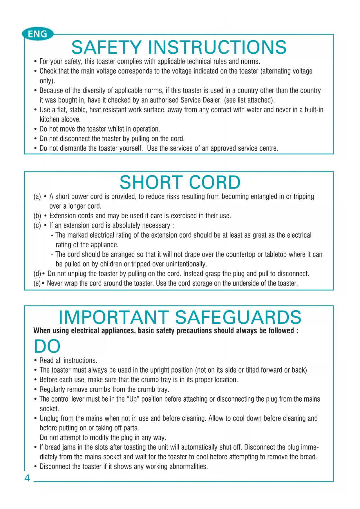 (d)• Do not unplug the toaster by pulling on the cord. Instead grasp the plug and pull to disconnect.