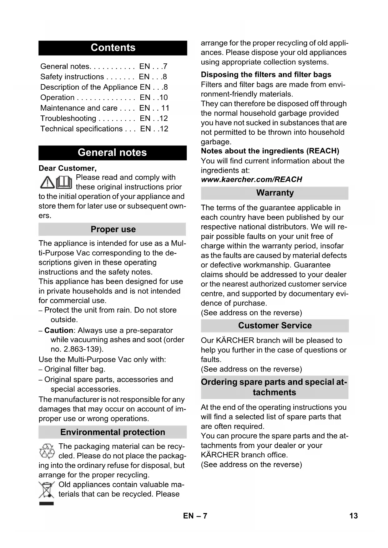 - Netzkabel Schalldruckpegel (EN 60704-2-1) Gewicht (ohne Zubehör) 12 DE– 7 Dear Customer, Please read and comply with these original instructions prior to the initial operation of your appliance and store them for later use or subsequent own- ers. The appliance is intended for use as a Mul- ti-Purpose Vac corresponding to the de- scriptions given in these operating instructions and the safety notes. This appliance has been designed for use in private households and is not intended for commercial use. – Protect the unit from rain. Do not store outside. – Caution: Always use a pre-separator while vacuuming ashes and soot (order no. 2.863-139). Use the Multi-Purpose Vac only with: – Original filter bag. – Original spare parts, accessories and special accessories. The manufacturer is not responsible for any damages that may occur on account of im- proper use or wrong operations. The packaging material can be recy- cled. Please do not place the packag- ing into the ordinary refuse for disposal, but arrange for the proper recycling. Old appliances contain valuable ma- terials that can be recycled. Please arrange for the proper recycling of old appli- ances. Please dispose your old appliances using appropriate collection systems. Filters and filter bags are made from envi- ronment-friendly materials. They can therefore be disposed off through the normal household garbage provided you have not sucked in substances that are not permitted to be thrown into household garbage. Notes about the ingredients (REACH) You will find current information about the ingredients at: www.kaercher.com/REACH The terms of the guarantee applicable in each country have been published by our respective national distributors. We will re- pair possible faults on your unit free of charge within the warranty period, insofar as the faults are caused by material defects or defective workmanship. Guarantee claims should be addressed to your dealer or the nearest authorized customer service centre, and supported by documentary evi- dence of purchase. (See address on the reverse) Our KÄRCHER branch will be pleased to help you further in the case of questions or faults. (See address on the reverse) At the end of the operating instructions you will find a selected list of spare parts that are often required. You can procure the spare parts and the at- tachments from your dealer or your KÄRCHER branch office. (See address on the reverse) Contents General notes