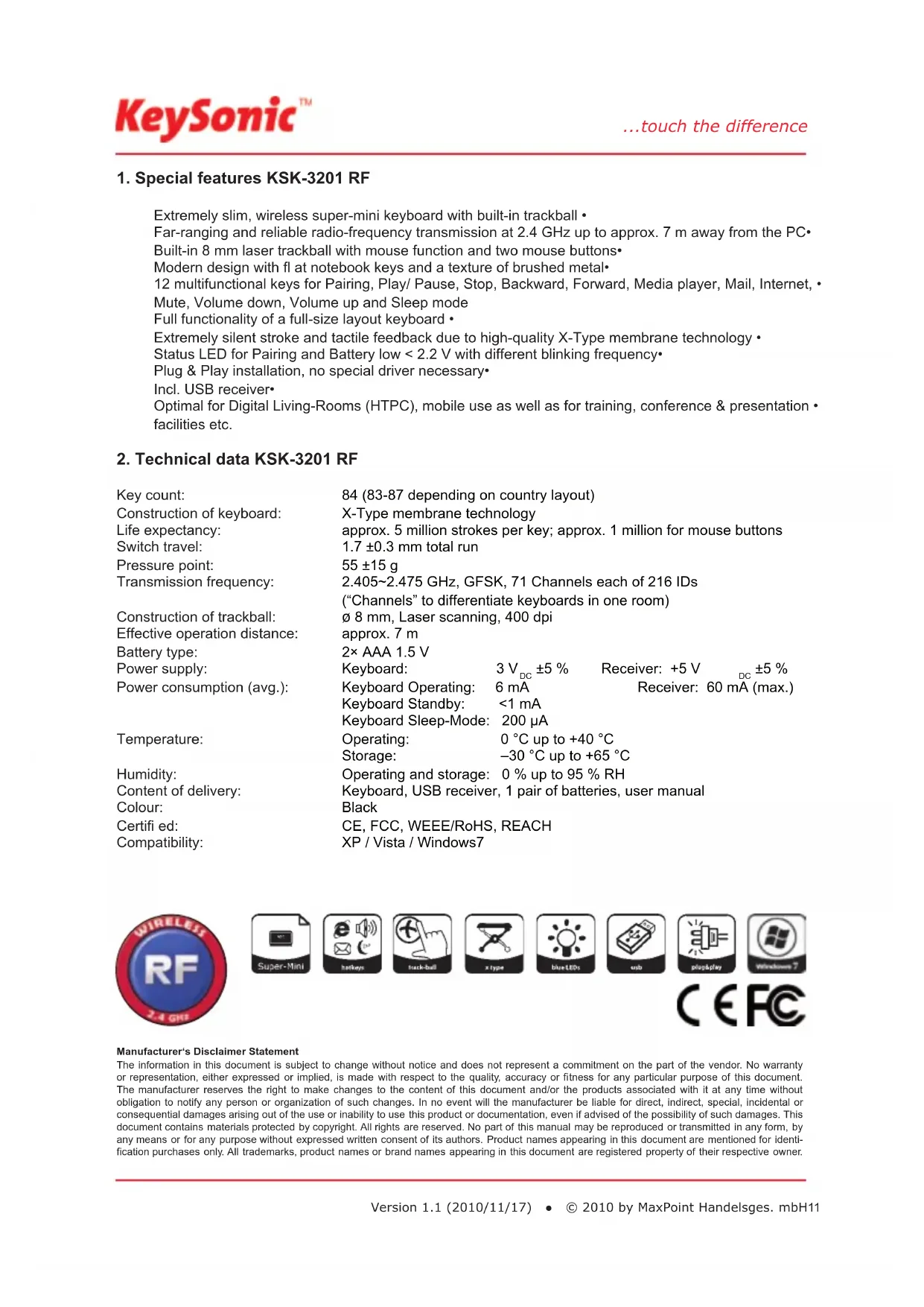 ±5 % Operation keyboard: 11.5 mA ±1 mA Operation mouse: 28 mA ±2 mA Standby: 3.4 mA (nach 3 Sek.) Sleep mode: 202~286 µA ±10 µA Operating: 0 °C up to +40 °C Storage: –30 °C up to +65 °C Operating and storage: 0 % up to 95 % RH Keyboard, USB Bluetooth adapter KSR-10 BT, 1 pair of batteries, user manual Black CE, FCC, WEEE/RoHS, REACH XP / Vista / Windows7...touch the difference Version 1.1 (2010/11/17) ● © 2010 by MaxPoint Handelsges. mbH