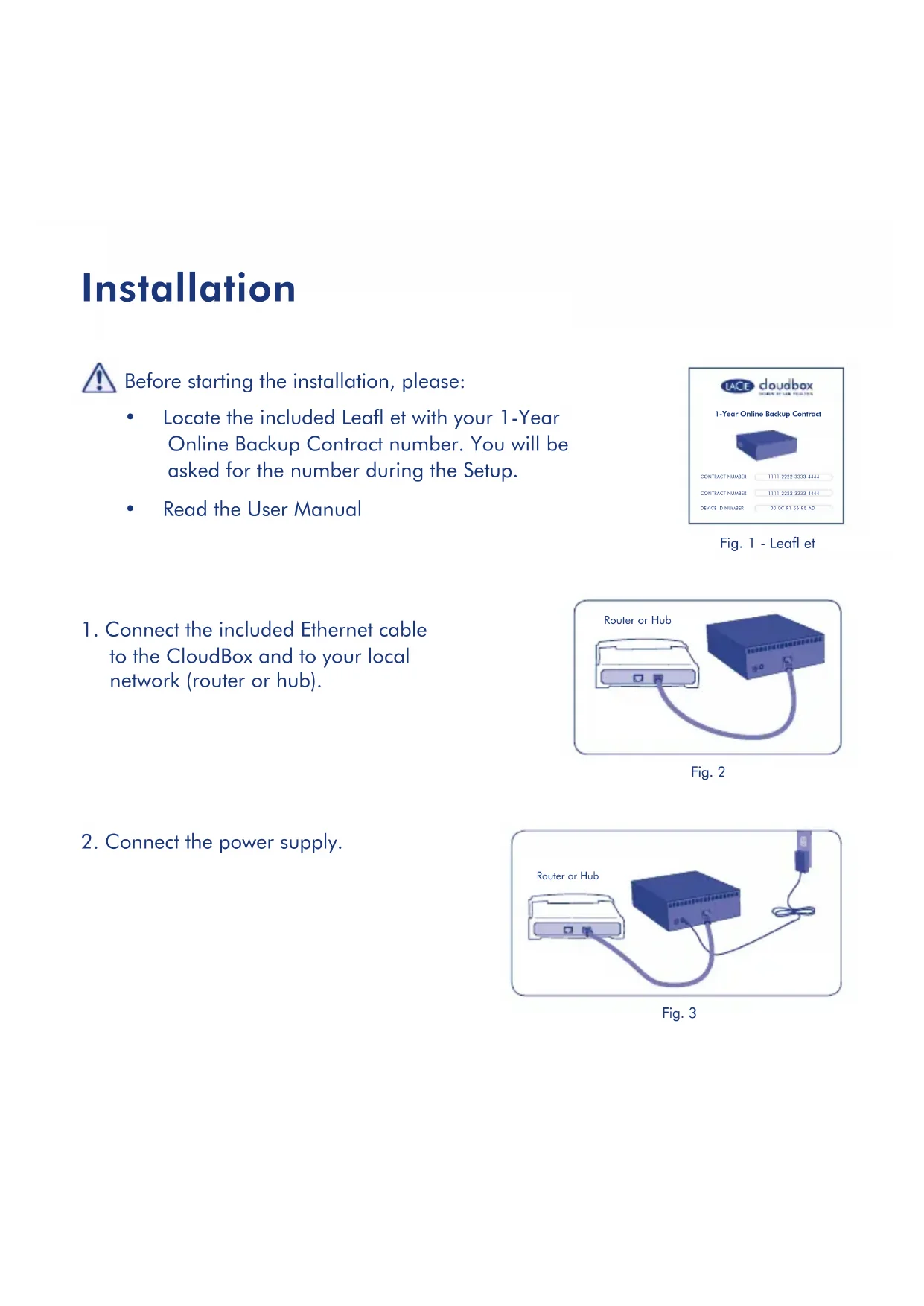 to the CloudBox and to your local network (router or hub). Fig. 1 - Leafl et Fig. 2 Fig. 3 InstallationFig. 4