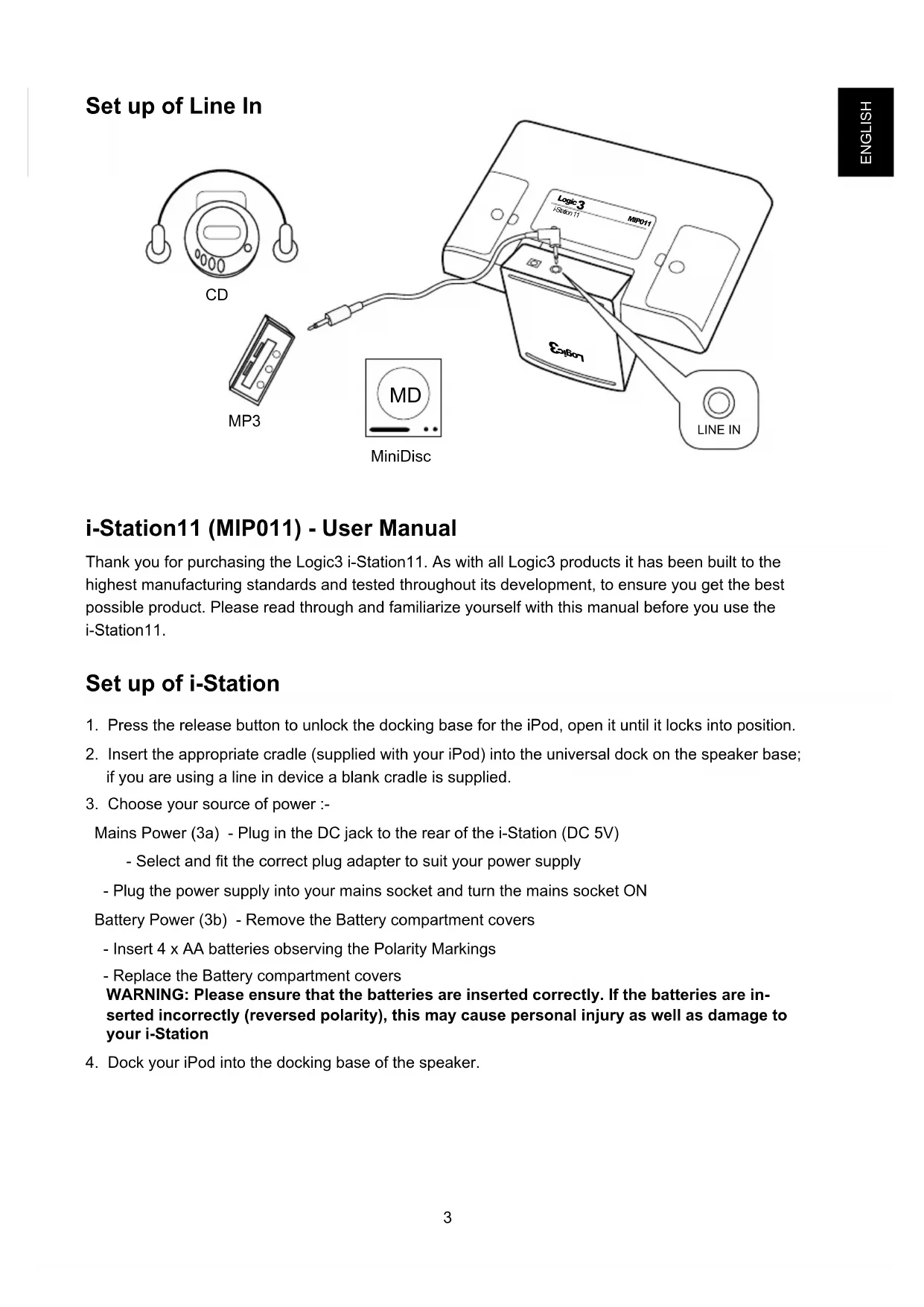 MP3 Set up of Line In LINE IN i-Station11 (MIP011) - User Manual Thank you for purchasing the Logic3 i-Station11. As with all Logic3 products it has been built to the highest manufacturing standards and tested throughout its development, to ensure you get the best possible product. Please read through and familiarize yourself with this manual before you use the i-Station11. Set up of i-Station