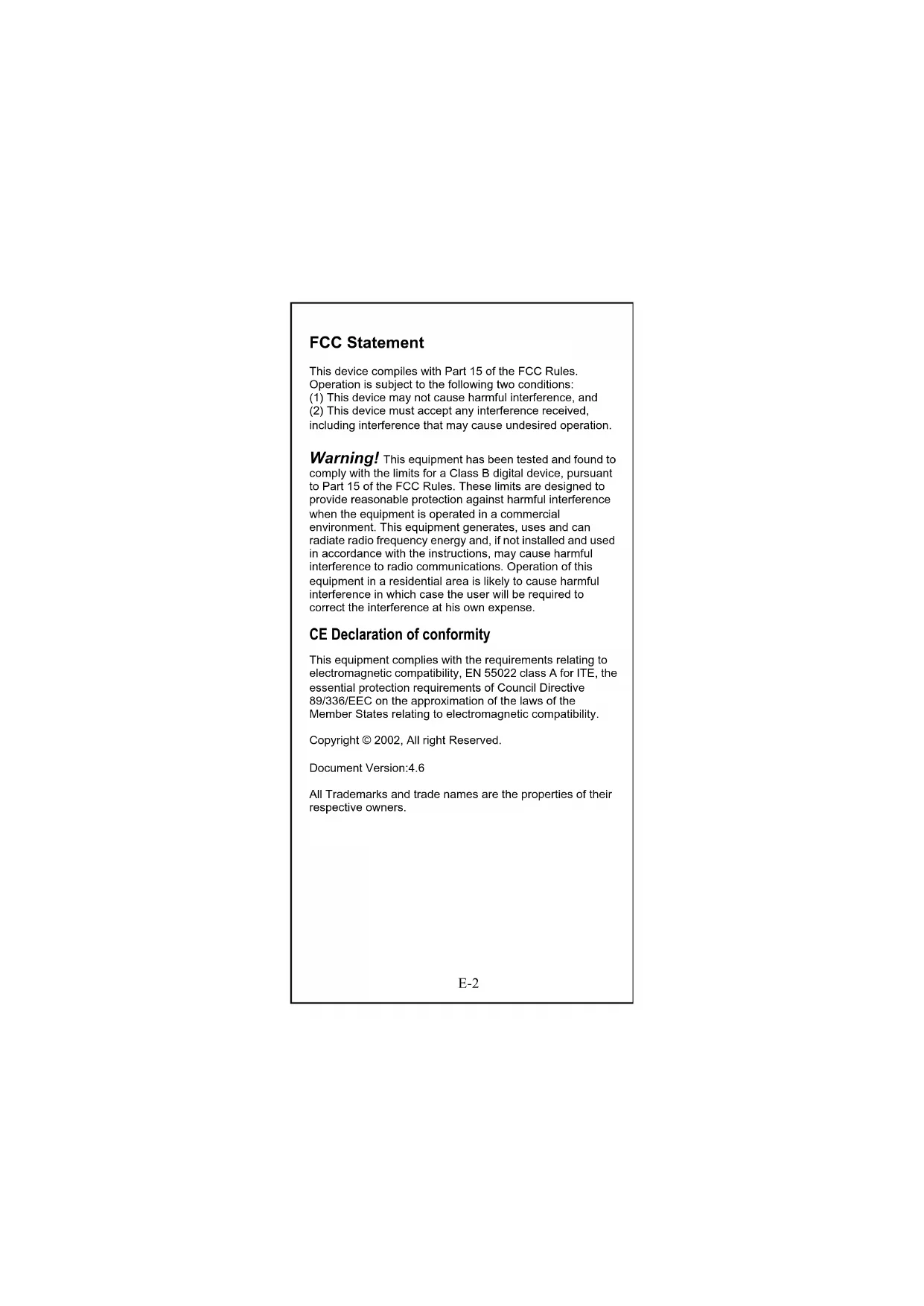 The help file in the diskette will describe the detail driver installation information for all popular operating systems. E-1210/100 Fast Ethernet PCI Adapter English Deutsch Italienisch Französisch Spanisch Ver. 4.6 D-1FCC Statement This device compiles with Part 15 of the FCC Rules. Operation is subject to the following two conditions: (1) This device may not cause harmful interference, and (2) This device must accept any interference received, including interference that may cause undesired operation. Warning! This equipment has been tested and found to comply with the limits for a Class B digital device, pursuant to Part 15 of the FCC Rules. These limits are designed to provide reasonable protection against harmful interference when the equipment is operated in a commercial environment. This equipment generates, uses and can radiate radio frequency energy and, if not installed and used in accordance with the instructions, may cause harmful interference to radio communications. Operation of this equipment in a residential area is likely to cause harmful interference in which case the user will be required to correct the interference at his own expense. CE Declaration of conformity This equipment complies with the requirements relating to electromagnetic compatibility, EN 55022 class A for ITE, the essential protection requirements of Council Directive 89/336/EEC on the approximation of the laws of the Member States relating to electromagnetic compatibility. Copyright © 2002, All right Reserved. Document Version:4.6 All Trademarks and trade names are the properties of their respective owners. D-21. Einführung Glückwunsch zu Ihrem Kauf des neuen 10/100 N-Way Fast Ethernet PCI Adapter. Dieses Handbuch beschreibt die Installation des Netzwerk Adapters. Dieser Adapter unterstützt 10BASE-T/100BASE-TX Fast Ethernet und entspricht den elektrischen und Protokoll Voraussetzungen der PCI Local Bus Spezifikation, Revision 2.0 und 2.1. Die Wake-On-LAN Eigenschaft ist optional für diesen Adapter.