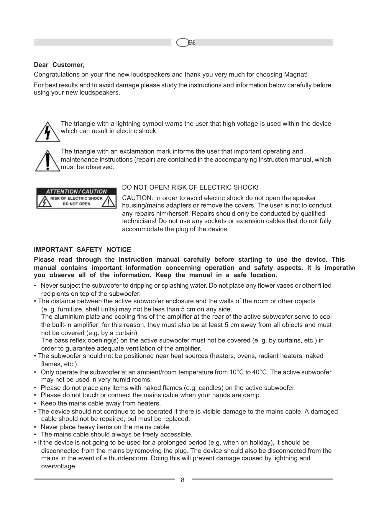 DDear Customer, Congratulations on your fine new loudspeakers and thank you very much for choosing Magnat! For best results and to avoid damage please study the instructions and information below carefully before using your new loudspeakers. The triangle with a lightning symbol warns the user that high voltage is used within the device which can result in electric shock. The triangle with an exclamation mark informs the user that important operating and maintenance instructions (repair) are contained in the accompanying instruction manual, which must be observed. DO NOT OPEN! RISK OF ELECTRIC SHOCK! CAUTION: In order to avoid electric shock do not open the speaker housing/mains adapters or remove the covers. The user is not to conduct any repairs him/herself. Repairs should only be conducted by qualified technicians! Do not use any sockets or extension cables that do not fully accommodate the plug of the device.