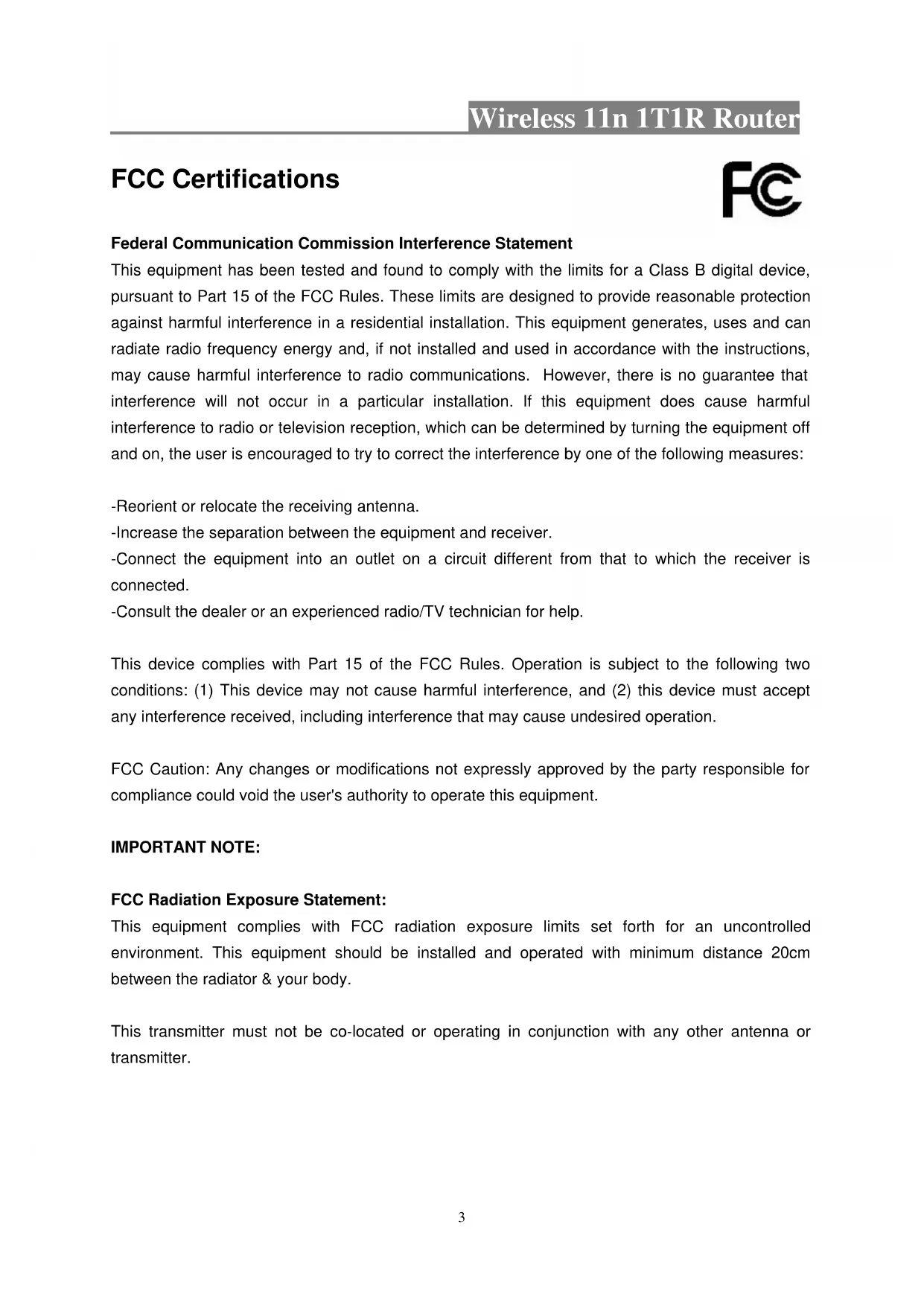 This equipment complies with FCC radiation exposure limits set forth for an uncontrolled environment. This equipment should be installed and operated with minimum distance 20cm between the radiator & your body.