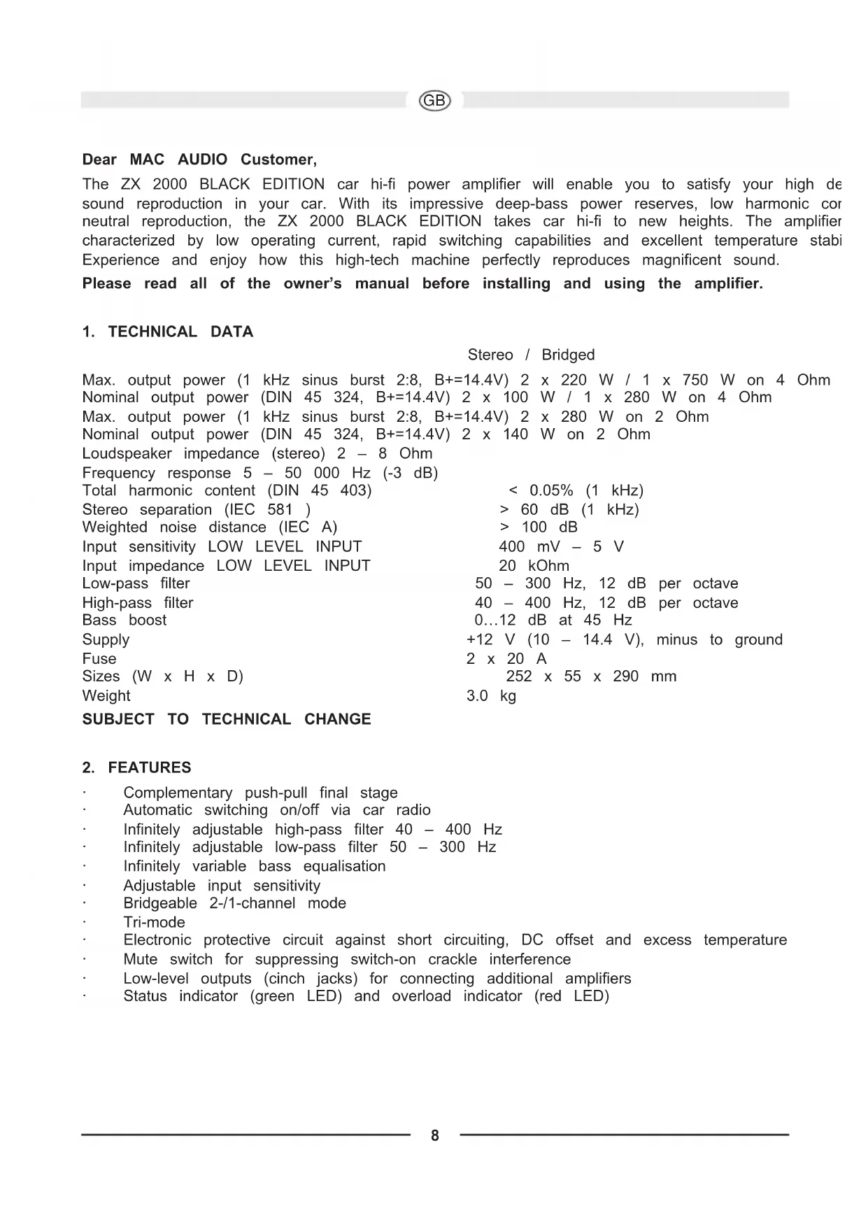 Dear MAC AUDIO Customer, The ZX 2000 BLACK EDITION car hi-fi power amplifier will enable you to satisfy your high demands on sound reproduction in your car. With its impressive deep-bass power reserves, low harmonic content and neutral reproduction, the ZX 2000 BLACK EDITION takes car hi-fi to new heights. The amplifier is characterized by low operating current, rapid switching capabilities and excellent temperature stability. Experience and enjoy how this high-tech machine perfectly reproduces magnificent sound. Please read all of the owner’s manual before installing and using the amplifier.