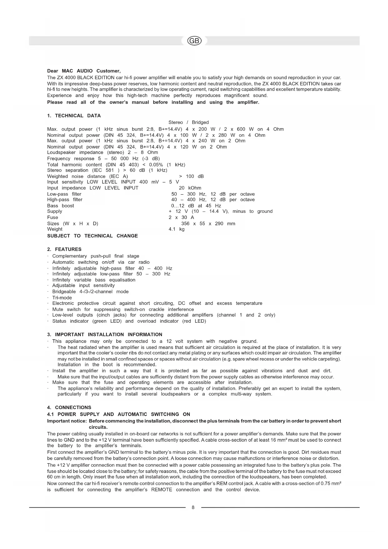 Dear MAC AUDIO Customer, The ZX 4000 BLACK EDITION car hi-fi power amplifier will enable you to satisfy your high demands on sound reproduction in your car. With its impressive deep-bass power reserves, low harmonic content and neutral reproduction, the ZX 4000 BLACK EDITION takes car hi-fi to new heights. The amplifier is characterized by low operating current, rapid switching capabilities and excellent temperature stability. Experience and enjoy how this high-tech machine perfectly reproduces magnificent sound. Please read all of the owner’s manual before installing and using the amplifier.