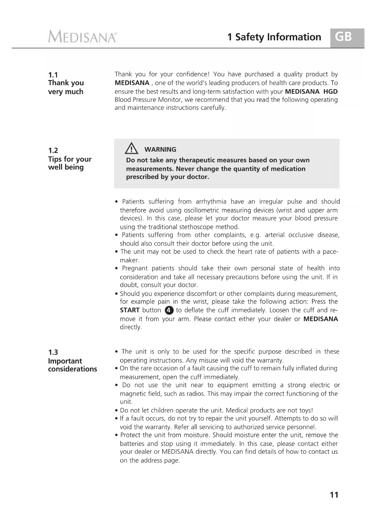 Tips for your well being Thank you for your confidence! You have purchased a quality product by MEDISANA , one of the world’s leading producers of health care products. To ensure the best results and long-term satisfaction with your MEDISANA HGD Blood Pressure Monitor, we recommend that you read the following operating and maintenance instructions carefully. WARNING Do not take any therapeutic measures based on your own measurements. Never change the quantity of medication prescribed by your doctor.