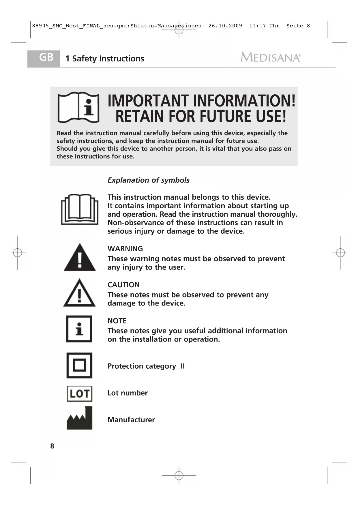 IMPORTANT INFORMATION! RETAIN FOR FUTURE USE! This instruction manual belongs to this device. It contains important information about starting up and operation. Read the instruction manual thoroughly. Non-observance of these instructions can result in serious injury or damage to the device. WARNING These warning notes must be observed to prevent any injury to the user. CAUTION These notes must be observed to prevent any damage to the device. NOTE These notes give you useful additional information on the installation or operation. Protection category II Lot number Manufacturer Read the instruction manual carefully before using this device, especially thesafety instructions, and keep the instruction manual for future use.Should you give this device to another person, it is vital that you also pass onthese instructions for use. Explanation of symbols