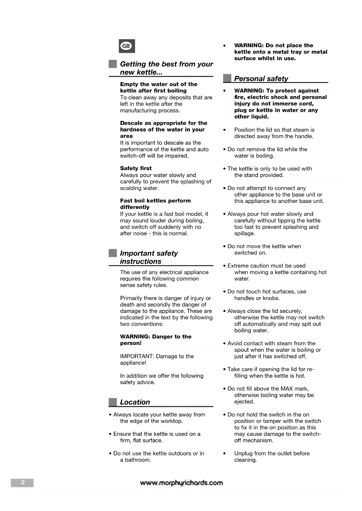 Download the instructions for your Kettle in PDF format for free! Find your manual 43687 - MORPHY RICHARDS and take your electronic device back in hand. On this page are published all the documents necessary for the use of your device. 43687 by MORPHY RICHARDS.