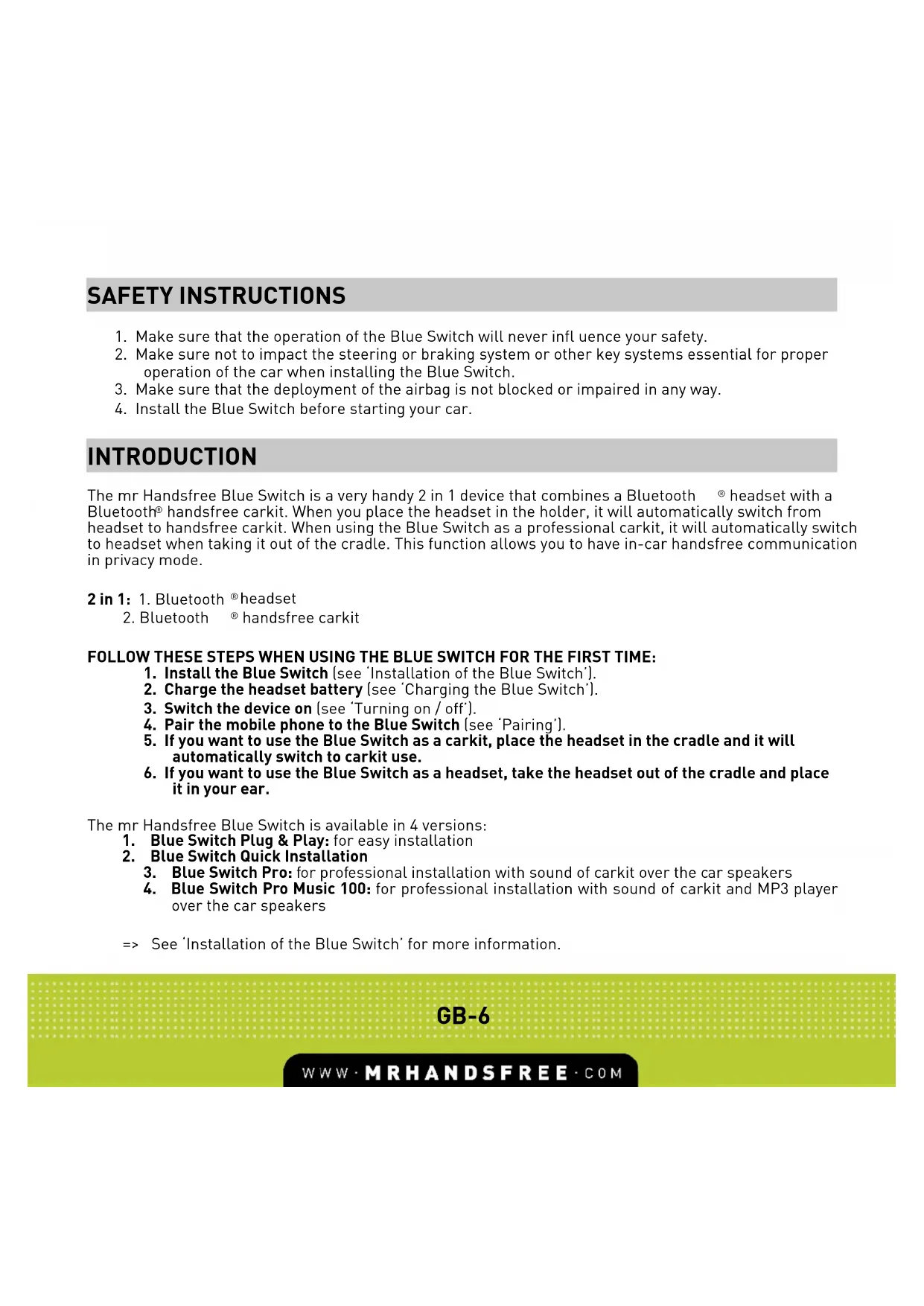 SAFETY INSTRUCTIONS The mr Handsfree Blue Switch is a very handy 2 in 1 device that combines a Bluetooth