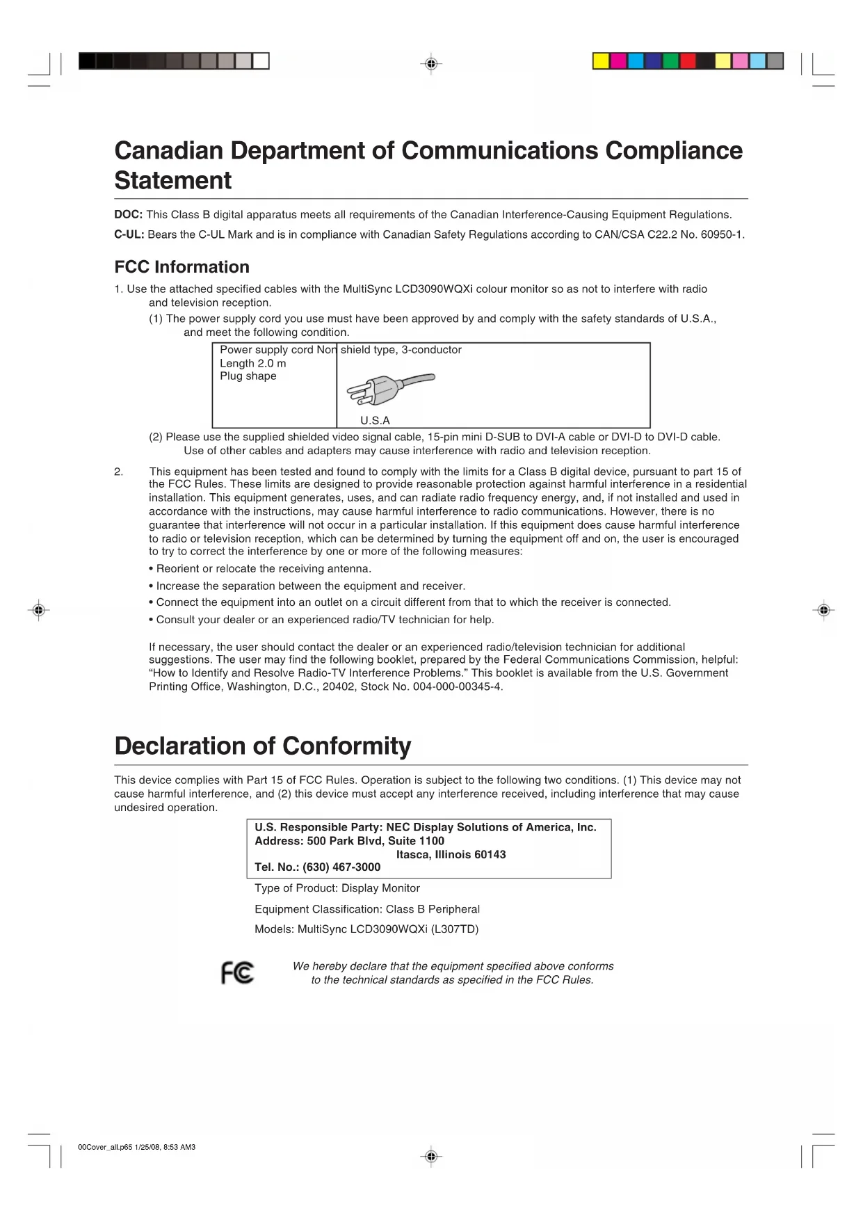 - Consult your dealer or an experienced radio/TV technician for help. If necessary, the user should contact the dealer or an experienced radio/television technician for additional suggestions. The user may find the following booklet, prepared by the Federal Communications Commission, helpful: “How to Identify and Resolve Radio-TV Interference Problems.” This booklet is available from the U.S. Government Printing Office, Washington, D.C., 20402, Stock No. 004-000-00345-4. Declaration of Conformity This device complies with Part 15 of FCC Rules. Operation is subject to the following two conditions. (1) This device may not cause harmful interference, and (2) this device must accept any interference received, including interference that may cause undesired operation. U.S. Responsible Party: NEC Display Solutions of America, Inc. Address: 500 Park Blvd, Suite 1100 Itasca, Illinois 60143 Tel. No.: (630) 467-3000 Type of Product: Display Monitor Equipment Classification: Class B Peripheral Models: MultiSync LCD3090WQXi (L307TD) We hereby declare that the equipment specified above conforms to the technical standards as specified in the FCC Rules. 00Cover_all.p65 1/25/08, 8:53 AM3TCO’03 Congratulations! The display you have just purchased carries the TCO’03 Displays label. This means that your display is designed, manufactured and tested according to some of the strictest quality and environmental requirements in the world. This makes for a high performance product, designed with the user in focus that also minimizes the impact on our natural environment. Some of the features of the TCO’03 Display requirements: Ergonomics