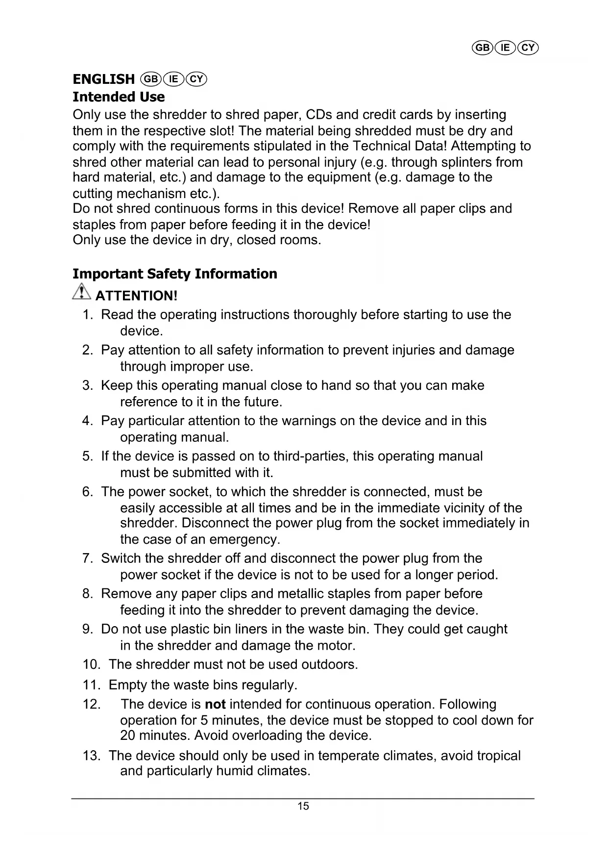 10. The shredder must not be used outdoors.