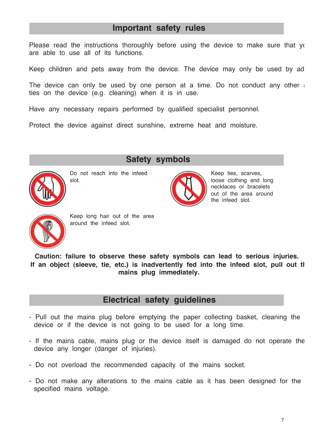 fications listed in the technical data. Shredding other materials can lead to injuries (for