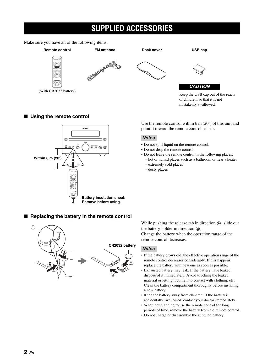 - This manual is printed prior to production. Design and specifications are subject to change in part as a result of improvements, etc. In case of differences between the manual and the product, the product has priority. English 1 En PREPARATION SUPPLIED ACCESSORIES Make sure you have all of the following items. Remote control FM antenna Dock cover USB cap SLEEP