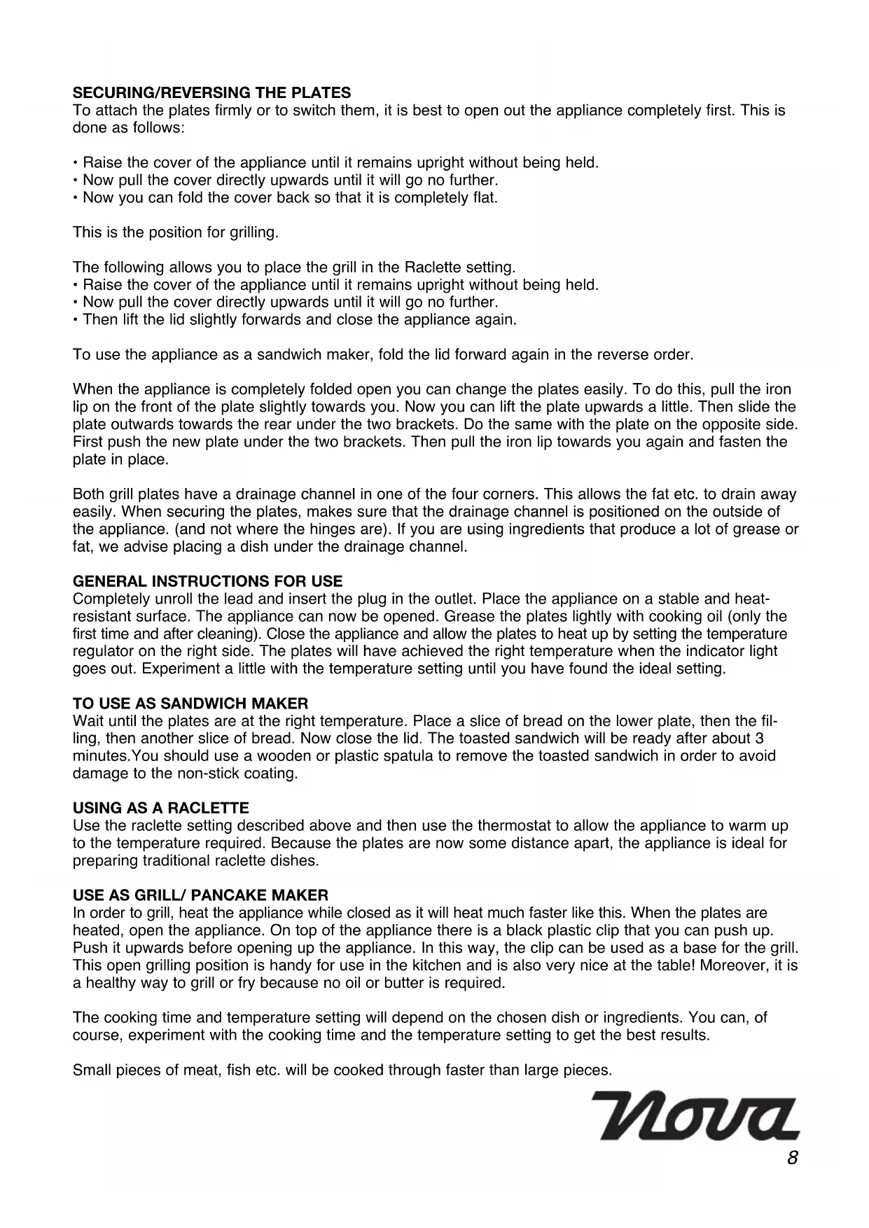 In order to grill, heat the appliance while closed as it will heat much faster like this. When the plates are heated, open the appliance. On top of the appliance there is a black plastic clip that you can push up. Push it upwards before opening up the appliance. In this way, the clip can be used as a base for the grill. This open grilling position is handy for use in the kitchen and is also very nice at the table! Moreover, it is a healthy way to grill or fry because no oil or butter is required. The cooking time and temperature setting will depend on the chosen dish or ingredients. You can, of course, experiment with the cooking time and the temperature setting to get the best results. Small pieces of meat, fish etc. will be cooked through faster than large pieces. 8Turn meat and fish once only in order to prevent them from drying out. For the same reason it is better to use a spatula than to prick with a fork. Use a wooden or plastic spatula on the plate. Do not use metal implements as these could damage the non-stick coating. You can also grill while the appliance is closed. To do this, place the meat, fish or other ingredients on the lowest plate before closing the appliance and clamping it shut. CLEANING ALWAYS UNPLUG THE APPLIANCE BEFORE CLEANING. Clean the appliance after each time that you use it. Allow the appliance to cool completely first. Clean the outside with a damp cloth. The plates can be cleaned using soapy water. You must rinse them with tap water afterwards. The non-stick coating should not be cleaned with sharp metal objects or aggressive detergents. If the plates are very dirty they should be soaked for half an hour in hot water and detergent. After grilling it is frequently only necessary to wipe the plates with kitchen paper while the appliance is still warm. DAMAGE TO THE PLATES CAUSED BY SHARP OBJECTS IS NOT COVERED BY THE GUARANTEE! NOVA ADVICE