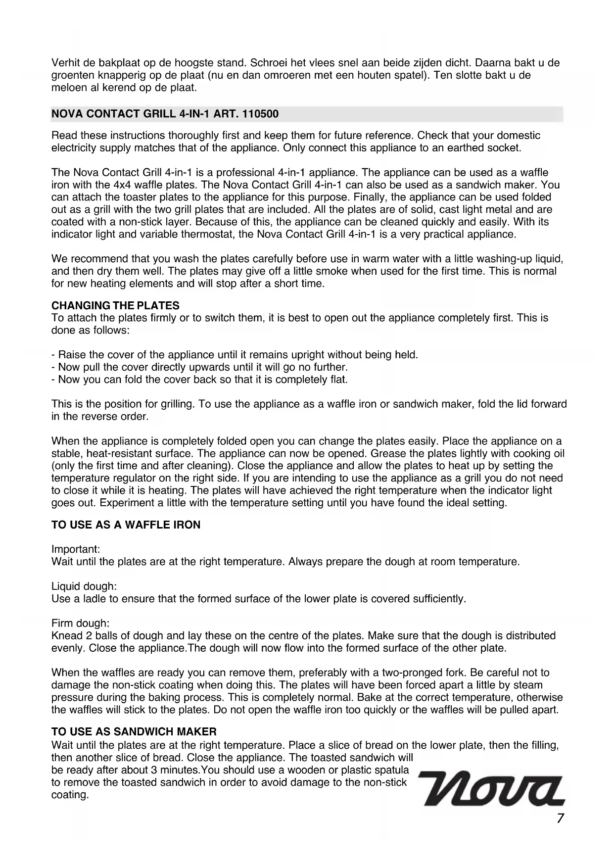 In order to grill, heat the appliance while closed as it will heat much faster like this. When the plates are heated, open the appliance. This open grilling position is handy for use in the kitchen and is also very nice at the table! Moreover, it is a healthy way to grill or fry because no oil or butter is required. The cooking time and temperature setting will depend on the chosen dish or ingredients.You can, of course, experiment with the cooking time and the temperature setting to get the best results. Small pieces of meat, fish etc. will be cooked through faster than large pieces. Turn meat and fish once only in order to prevent them from drying out. For the same reason it is better to use a spatula than to prick with a fork. Use a wooden or plastic spatula on the frying plate. Do not use metal implements as these could damage the non-stick coating. You can also grill while the appliance is closed. To do this, place the meat, fish or other ingredients on the lowest frying plate before closing the appliance. CLEANING ALWAYS UNPLUG THE APPLIANCE BEFORE CLEANING. Clean the appliance after each time that you use it. Allow the appliance to cool completely first. Clean the outside with a damp cloth. The plates should be cleaned in warm water with washing-up liquid and then rinsed with clean water from the tap. Do not use any sharp metal objects or aggressive substances on the non-stick coating. If the plates are very dirty they should be soaked for half an hour in hot water and detergent. After grilling it is frequently only necessary to wipe the plates with kitchen paper while the appliance is still warm. DAMAGE TO THE PLATES FROM SHARP OBJECTS IS NOT COVERED UNDER THE GUARANTEE! NOVA ADVICE - Place the appliance on a stable and heat-resistant surface. - When you use the appliance in the open position the table or kitchen surface will become very hot. For that reason, never put the open appliance on an unprotected plastic surface. - Never immerse the appliance in water or any other liquid. - The outside of the appliance will become hot, so you should only hold it by the handle. - Ensure that the appliance is not so close to the edge of the table or work surface that someone could knock it off. Also, ensure that the cable is not trailing where someone could trip over it. - Do not use the appliance if it is damaged or if the cable is damaged. Instead, send it to our service department. With this type of appliance a damaged cable should only be replaced by our service department using special tools. - Do not place the appliance on or directly adjacent to a warm hotplate or other source of heat. - Always unplug the appliance before cleaning or if any fault develops. - The plates get very hot. Ensure that children cannot reach them, and be careful with them yourself. - Do not use any abrasive cleaning materials. - Only use the apparatus according to the instructions. - Do not use any accessories that are not recommended by the manufacturer, - The cable should never be allowed to come into contact with the plates. - This appliance is not intended for use by persons(including children) with reduced physical, sensory or mental capabilities or lack of experience and knowledge unless they have been given initial supervision or instruction concerning use of the appliance by a person responsible for their safety. - Children shall be supervised to ensure that they do not play with the appliance. - If the supply cord is damaged, it must be replaced by the manufacturer, its service agent or similarly qualified persons in order to avoid a hazard. 8SOME RECIPES WAFFLE RECIPE (FOR ABOUT 8 WAFFLES) Ingredients: 500 grams butter 500 grams self-raising flour 500 grams sugar 8 eggs Preparation: Melt the butter slowly, then add the sugar and 8 egg yolks. Mix them all to a creamy consistency. Whip the egg whites until stiff. Now add the sieved flour, slowly at first, and mix it to form a thick mass. Finally, add the whipped egg whites. The dough is now ready for use.