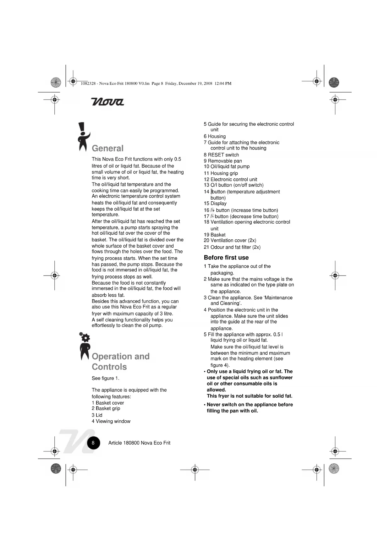 - Never switch on the appliance before filling the pan with oil. 1082328 - Nova Eco Frit 180800 V0.fm Page 8 Friday, December 19, 2008 12:04 PM9 Article 180800 Nova Eco Frit Use