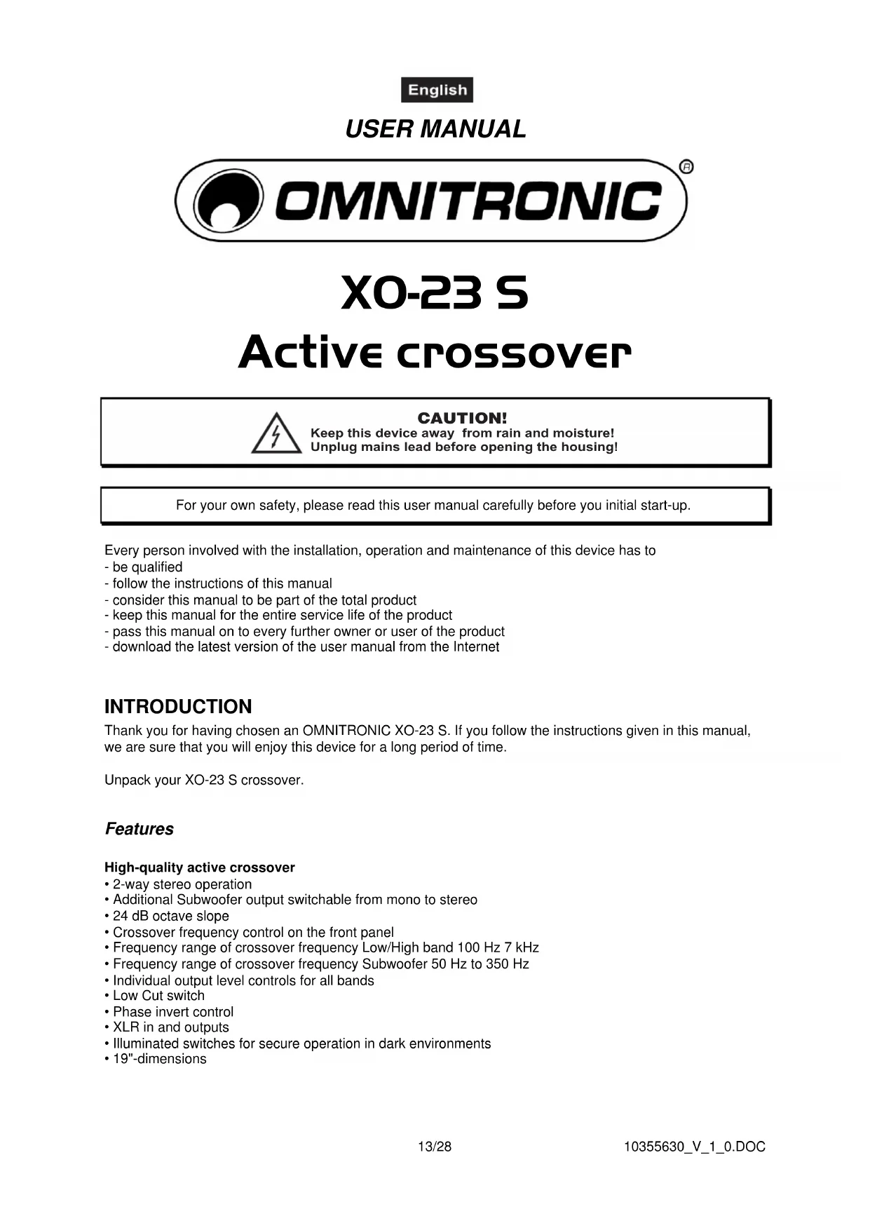 USER MANUAL XO-23 S Active crossover CAUTION! Keepthisdeviceawayfromrainandmoisture!Unplugmainsleadbeforeopeningthehousing!For your own safety, please read this user manual carefully before you initial start-up.Every person involved with the installation, operation and maintenance of this device has to- be qualified- follow the instructions of this manual- consider this manual to be part of the total product- keep this manual for the entire service life of the product- pass this manual on to every further owner or user of the product- download the latest version of the user manual from the Internet INTRODUCTION Thank you for having chosen an OMNITRONIC XO-23 S. If you follow the instructions given in this manual,we are sure that you will enjoy this device for a long period of time.Unpack your XO-23 S crossover. Features High-quality active crossover• 2-way stereo operation• Additional Subwoofer output switchable from mono to stereo• 24 dB octave slope• Crossover frequency control on the front panel• Frequency range of crossover frequency Low/High band 100 Hz 7 kHz• Frequency range of crossover frequency Subwoofer 50 Hz to 350 Hz• Individual output level controls for all bands• Low Cut switch• Phase invert control• XLR in and outputs• Illuminated switches for secure operation in dark environments• 19"-dimensions10355630_V_1_0.DOC 14/28 SAFETY INSTRUCTIONS CAUTION! Becarefulwithyouroperations.Withadangerousvoltageyoucansufferadangerous electricshockwhentouchingthewires! This device has left our premises in absolutely perfect condition. In order to maintain this condition and to ensure a safe operation, it is absolutely necessary for the user to follow the safety instructions and warning notes written in this user manual. Important: Damages caused by the disregard of this user manual are not subject to warranty. The dealer will not accept liability for any resulting defects or problems. If the device has been exposed to drastic temperature fluctuation (e.g. after transportation), do not switch it on immediately. The arising condensation water might damage your device. Leave the device switched off until it has reached room temperature. Please make sure that there are no obvious transport damages. Should you notice any damages on the A/C connection cable or on the casing, do not take the device into operation and immediately consult your local dealer. This device falls under protection-class I. The power plug must only be plugged into a protection class I outlet. The voltage and frequency must exactly be the same as stated on the device. Wrong voltages or power outlets can lead to the destruction of the device and to mortal electrical shock. Always plug in the power plug least. The power plug must always be inserted without force. Make sure that the plug is tightly connected with the outlet. Never let the power-cord come into contact with other cables! Handle the power-cord and all connections with the mains with particular caution! Never touch them with wet hands, as this could lead to mortal electrical shock. Never modify, bend, strain mechanically, put pressure on, pull or heat up the power cord. Never operate next to sources of heat or cold. Disregard can lead to power cord damages, fire or mortal electrical shock. The cable insert or the female part in the device must never be strained. There must always be sufficient cable to the device. Otherwise, the cable may be damaged which may lead to mortal damage. Make sure that the power-cord is never crimped or damaged by sharp edges. Check the device and the power-cord from time to time. If extension cords are used, make sure that the core diameter is sufficient for the required power consumption of the device. All warnings concerning the power cords are also valid for possible extension cords. Always disconnect from the mains, when the device is not in use or before cleaning it. Only handle the power-cord by the plug. Never pull out the plug by tugging the power-cord. Otherwise the cable or plug can be damaged leading to mortal electrical shock. If the power plug or the power switch is not accessible, the device must be disconnected via the mains. If the power plug or the device is dusty, the device must be taken out of operation, disconnected and then be cleaned with a dry cloth. Dust can reduce the insulation which may lead to mortal electrical shock. More severe dirt in and at the device should only be removed by a specialist. There must never enter any liquid into power outlets, extension cords or any holes in the housing of the device. If you suppose that also a minimal amount of liquid may have entered the device, it must immediately be disconnected. This is also valid, if the device was exposed to high humidity. Also if the device is still10355630_V_1_0.DOC 15/28 running, the device must be checked by a specialist if the liquid has reduced any insulation. Reduced insulation can cause mortal electrical shock. There must never be any objects entering into the device. This is especially valid for metal parts. If any metal parts like staples or coarse metal chips enter into the device, the device must be taken out of operation and disconnected immediately. Malfunction or short-circuits caused by metal parts may cause mortal injuries. Before the device is switched on all faders and volume controls have to be set to "0" or "min" position. CAUTION: Turn the amplifier on last and off first! Please note that damages caused by manual modifications on the device or unauthorized operation by unqualified persons are not subject to warranty. Keep away children and amateurs! HEALTH HAZARD! By operating an amplifying system, you can produce excessive sound pressure levels that may lead to permanent hearing loss. There are no serviceable parts inside the device. Maintenance and service operations are only to be carried out by authorized dealers. OPERATING DETERMINATIONS This device is a professional crossover. This product is 