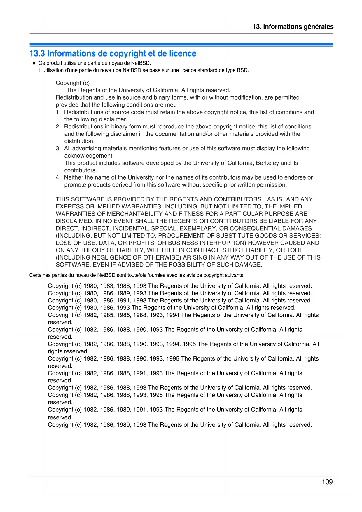Certaines parties du noyau de NetBSD sont fournies avec des licences qui diffèrent légèrement de la licence de type Berkeley susmentionnée. Veuillez vous reporter au code source du noyau de NetBSD pour plus de détails. Le code source du noyau de NetBSD est fourni par les référentiels CVS NetBSD (http://cvsweb.netbsd.org/bsdweb.cgi/), et ce produit inclut des parties de code source dans les répertoires suivants. http://cvsweb.netbsd.org/bsdweb.cgi/src/sys/kern/ http://cvsweb.netbsd.org/bsdweb.cgi/src/sys/net/ http://cvsweb.netbsd.org/bsdweb.cgi/src/sys/netinet/ Copyright (c) 1996,1999 by Internet Software Consortium. Copyright (c) 1996-1999 by Internet Software Consortium. Copyright (c) 1997 Jonathan Stone and Jason R. Thorpe. All rights reserved. Copyright (c) 1997 Christos Zoulas. All rights reserved. Copyright (c) 1997 Manuel Bouyer. All rights reserved. Copyright (c) 1997, 1998 The NetBSD Foundation, Inc. All rights reserved. Copyright (c) 1997, 1998, 1999, 2000 The NetBSD Foundation, Inc. All rights reserved. Copyright (c) 1997, 1998, 1999, 2001 The NetBSD Foundation, Inc. All rights reserved. Copyright (c) 1997, 1998, 1999, 2002 The NetBSD Foundation, Inc. All rights reserved. Copyright (c) 1997, 1998, 2000, 2001 The NetBSD Foundation, Inc. All rights reserved. Copyright (c) 1997, 1998, 2001 The NetBSD Foundation, Inc. All rights reserved. Copyright (c) 1997,98 The NetBSD Foundation, Inc. All rights reserved. Copyright (C) 1997-2000 Sony Computer Science Laboratories Inc. All rights reserved. Copyright (c) 1997-2002 The NetBSD Foundation, Inc. All rights reserved. Copyright (c) 1998 The NetBSD Foundation, Inc. All rights reserved. Copyright (c) 1998 Todd C. Miller <Todd.Miller@courtesan.com> All rights reserved. Copyright (c) 1998, 1999 The NetBSD Foundation, Inc. All rights reserved. Copyright (c) 1998, 1999, 2000 The NetBSD Foundation, Inc. All rights reserved. Copyright (c) 1998, 1999, 2000, 2001 The NetBSD Foundation, Inc. All rights reserved. Copyright (c) 1998, 2000 The NetBSD Foundation, Inc. All rights reserved. Copyright (c) 1998, 2000, 2001 The NetBSD Foundation, Inc. All rights reserved. Copyright (c) 1999 The NetBSD Foundation, Inc. All rights reserved. Copyright (C) 1999 WIDE Project. All rights reserved. Copyright (c) 1999, 2000 Jason L. Wright (jason@thought.net) All rights reserved. Copyright (c) 1999, 2000 The NetBSD Foundation, Inc. All rights reserved. Copyright (c) 1999, 2000, 2001 The NetBSD Foundation, Inc. All rights reserved. Copyright (c) 1999, 2001 The NetBSD Foundation, Inc. All rights reserved. Copyright (c) 2000 The NetBSD Foundation, Inc. All rights reserved. Copyright (c) 2000, 2001 The NetBSD Foundation, Inc. All rights reserved. Copyright (c) 2000, 2001, 2002 The NetBSD Foundation, Inc. All rights reserved. Copyright (c) 2001 The NetBSD Foundation, Inc. All rights reserved. Copyright (c) 2002 The NetBSD Foundation, Inc. All rights reserved. Copyright 1998 Massachusetts Institute of Technology. All rights reserved. Copyright 2001 Wasabi Systems, Inc. All rights reserved. Portions Copyright (c) 1993 by Digital Equipment Corporation. Portions Copyright (c) 1995 by International Business Machines, Inc. Copyright (c) 1983, 1989 The Regents of the University of California. All rights reserved. Copyright (c) 1996 by Internet Software Consortium. All rights reserved. Copyright (c) 1980, 1986, 1989 Regents of the University of California. All rights reserved. Copyright (c) 1988 The Regents of the University of California. All rights reserved. Copyright (c) 1992, 1993 The Regents of the University of California. All rights reserved. Copyright (c) 1994 Christopher G. Demetriou. All rights reserved. Copyright (c) 1997 The NetBSD Foundation, Inc. All rights reserved. Copyright (c) 1999 The NetBSD Foundation, Inc. All rights reserved. Copyright (c) 2001 The NetBSD Foundation, Inc. All rights reserved. Copyright (c) 1996 Gardner Buchanan <gbuchanan@shl.com> All rights reserved.13. Informations générales