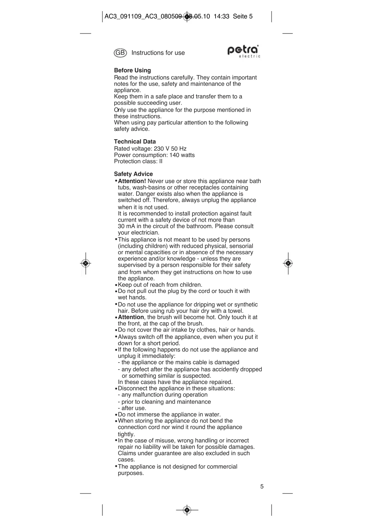 AC3_091109_AC3_080509 18.05.10 14:33 Seite 5• In case the cord of this appliance is damaged, it has to be replaced by an authorised service agent of the manufacturer or a person having similar qualifications. Substantial dangers for the user can appear from inappropriate repairs.
