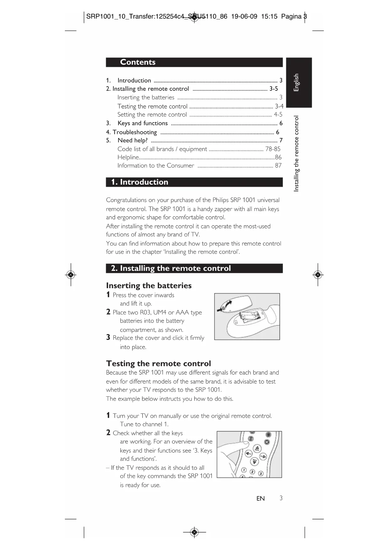 Inserting the batteries 1 Press the cover inwards and lift it up. 2 Place two R03, UM4 or AAA type batteries into the battery compartment, as shown. 3 Replace the cover and click it firmly into place. Testing the remote control Because the SRP 1001 may use different signals for each brand and even for different models of the same brand, it is advisable to test whether your TV responds to the SRP 1001. The example below instructs you how to do this. 1 Turn your TV on manually or use the original remote control. Tune to channel 1. 2 Check whether all the keys are working. For an overview of the keys and their functions see ‘3. Keys and functions’. – If the TV responds as it should to all of the key commands the SRP 1001 is ready for use. SRP1001_10_Transfer:125254c4_SRU5110_86 19-06-09 15:15 Pagina 3• If the device does not respond at all or not to all of the key commands, follow the instructions under ‘Setting the remote control’ or for online setup got to: www.philips.com/urc. Setting the remote control This is only necessary if your TV does not respond to the SRP 1001. If that is the case, the SRP 1001 does not recognize the brand and/or model of your TV and you need to program the remote control to do so. The example below instructs you how to do this. You can set the remote control either manually or automatically. Manually setting the remote control 1 Turn on the TV manually or use the original remote control. Tune in to channel 1. 2 Look up the brand of your TV in the code list at the back of this manual. One or more 3-figure key codes are shown for each brand. Note the first code. 3 Keep keys 1 and 3 on the SRP 1001 pressed simultaneously for five seconds until the indicator light remains lit. 4 Then enter the code noted in step 2 using the code keys. – The indicator light will now flash twice. If the indicator light flashes once for an extended period, the code has not been entered properly or the wrong code has been entered. Start again from step 2. 5 Point the SRP 1001 at the TV and check that it responds as it should. – If the TV responds to all of the key commands, the SRP 1001 is ready for use. Do not forget to note your code.