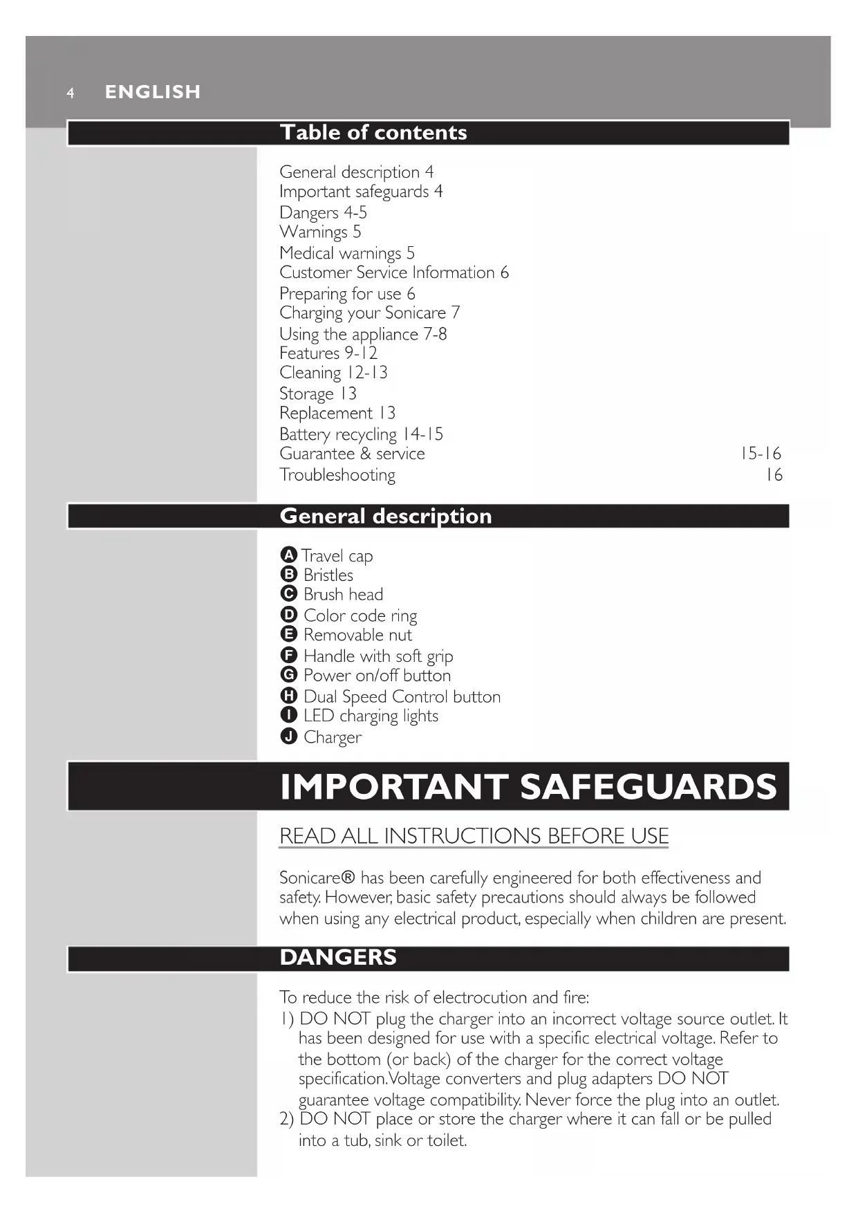 IMPORTANT SAFEGUARDS READ ALL INSTRUCTIONS BEFORE USE Sonicare\ has been carefully engineered for both effectiveness and