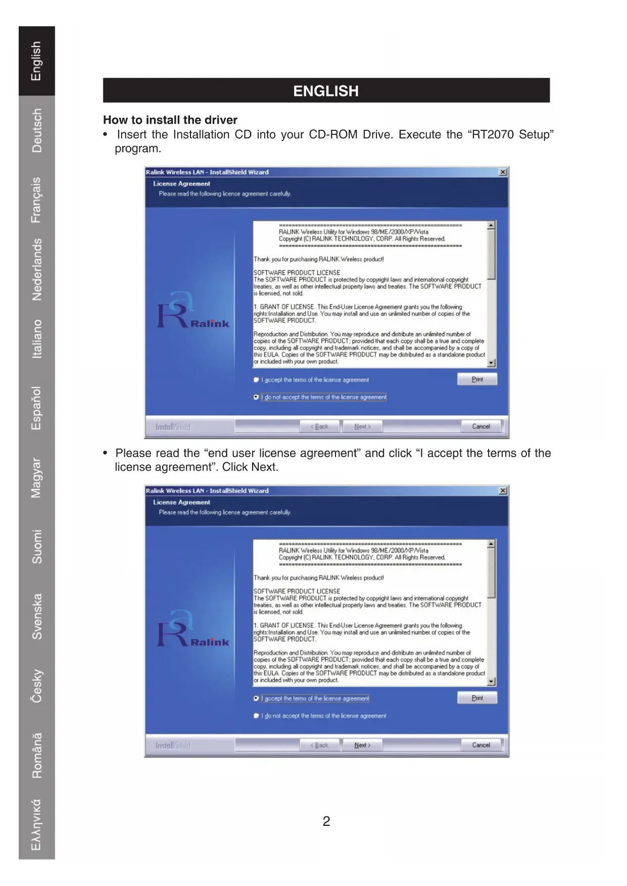 - Insert the Installation CD into your CD-ROM Drive. Execute the "RT2070 Setup" program.