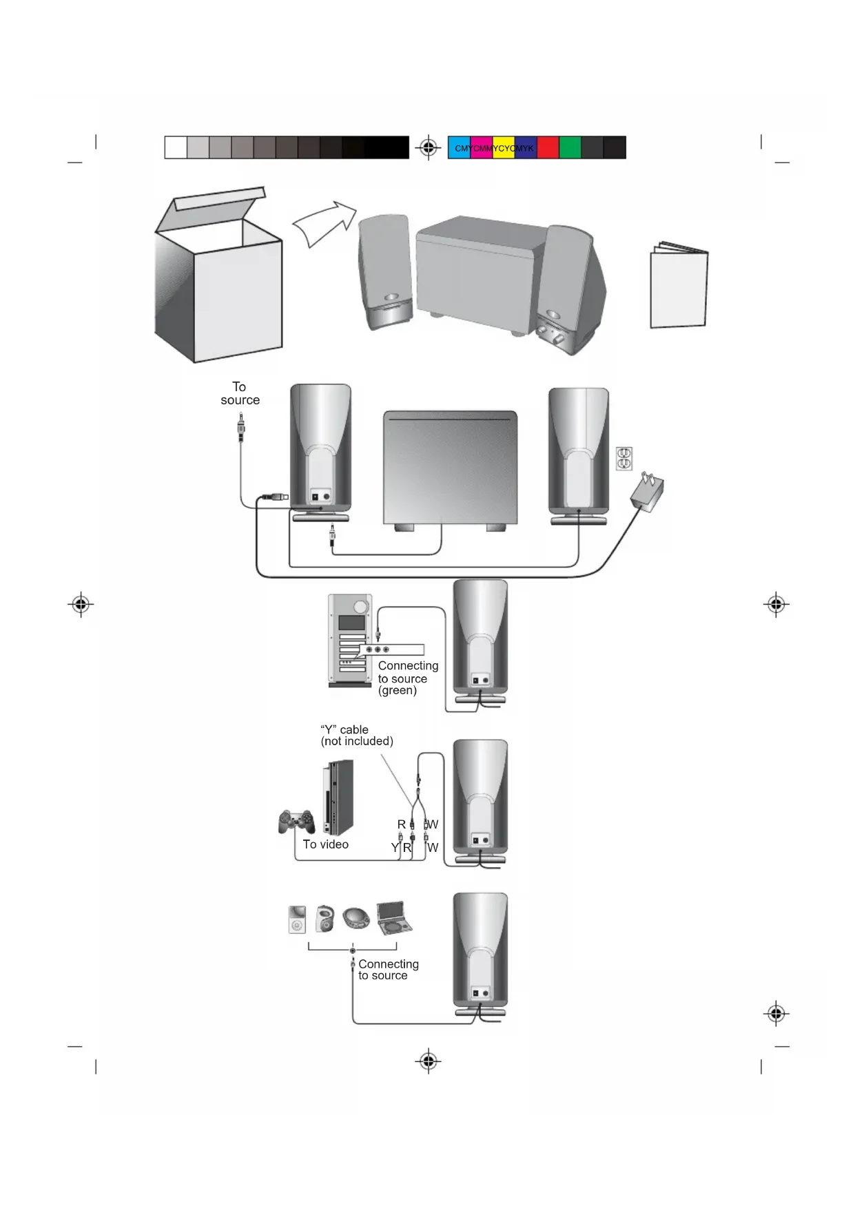 , MP3 players, DVD players, and other portable audio devices. The system offers high efficient, long excursion drivers combined with a low distortion, high powered amplifier that provides deep base with clarity and greater dynamic range. Two satellite Speakers One Subwoofer AC adapter Owners Guide with connection diagram Read Instructions Carefully All safety and operating instructions should be read before this device is operated. Power Supply Do not plug power supply in until all connections are made. Power Sources Use only the AC power cord supplied with these speakers. Cyber Acoustics will not be held responsible for damage caused by another power supply. Heat Keep speakers out of extreme heat, and away from sources producing extreme heat, such as, space heaters, radiators, stoves, and other devices emitting heat. Water and Moisture Keep speakers out of the rain and humid conditions to avoid electric shock. Keep speakers away from water, such as, sinks, bathtubs, swimming pools, washing machines, tubs of water, etc. in order to avoid electric shock. Keep water from dripping on the device, do not put objects containing water, such as vases on top of the device, and do not put the device near standing water. Cleaning Use a dry cloth for cleaning. Do not wipe any part of the system with cleaning solvents, such as, furniture wax, bleach, benzene, or ammonia. Subwoofer Place on the floor, near a wall, for optimum performance. Satellite Speakers Usually are placed on opposite sides of the listening device. As far apart as possible is usually best. An example would be listening to the speakers using a computer. Place the left satellite speaker on the far left corner of the desk. Place the right satellite speaker on the far right corner of the desk. 1C M Y CM MY CY CMY K SPEAKER CONNECTION There are a variety of devices these speakers can connect to, such as, CD players, iPod, DVD players, MP3 players and portable audio devices. Please read the step by step instructions along with the diagrams provided to identify which diagram most closely matches your source. Desktop Computers