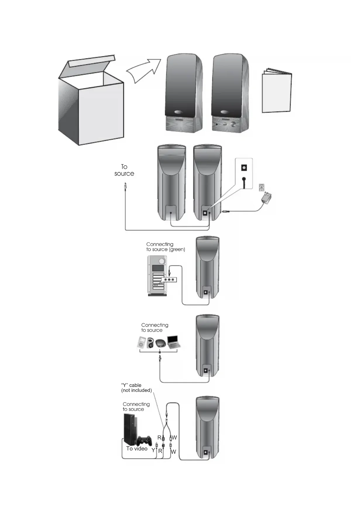 There are a variety of devices these speakers can connect to, such as, CD players, iPod, DVD players, MP3 players and portable audio devices. Please read the step by step instructions along with the diagrams provided to identify which diagram most closely matches your source.
