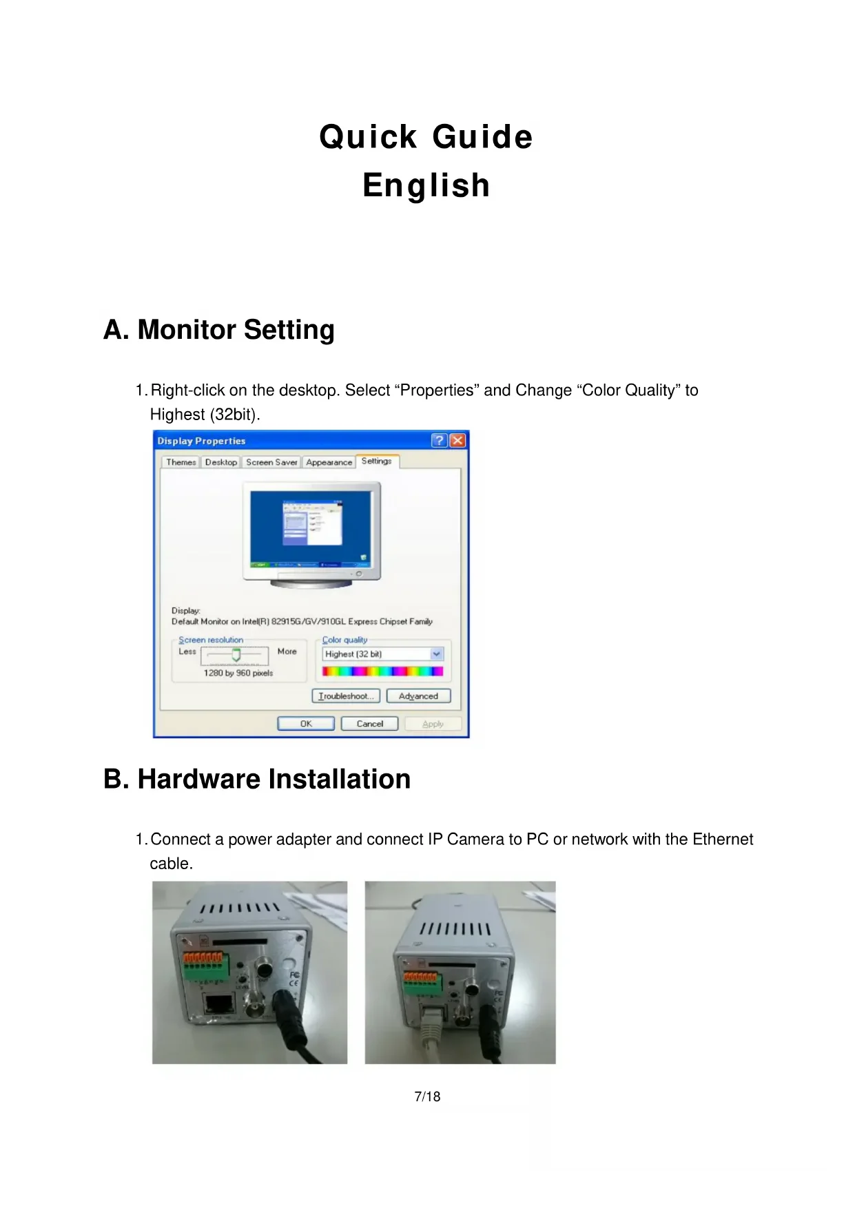 - Connect a power adapter and connect IP Camera to PC or network with the Ethernet cable.