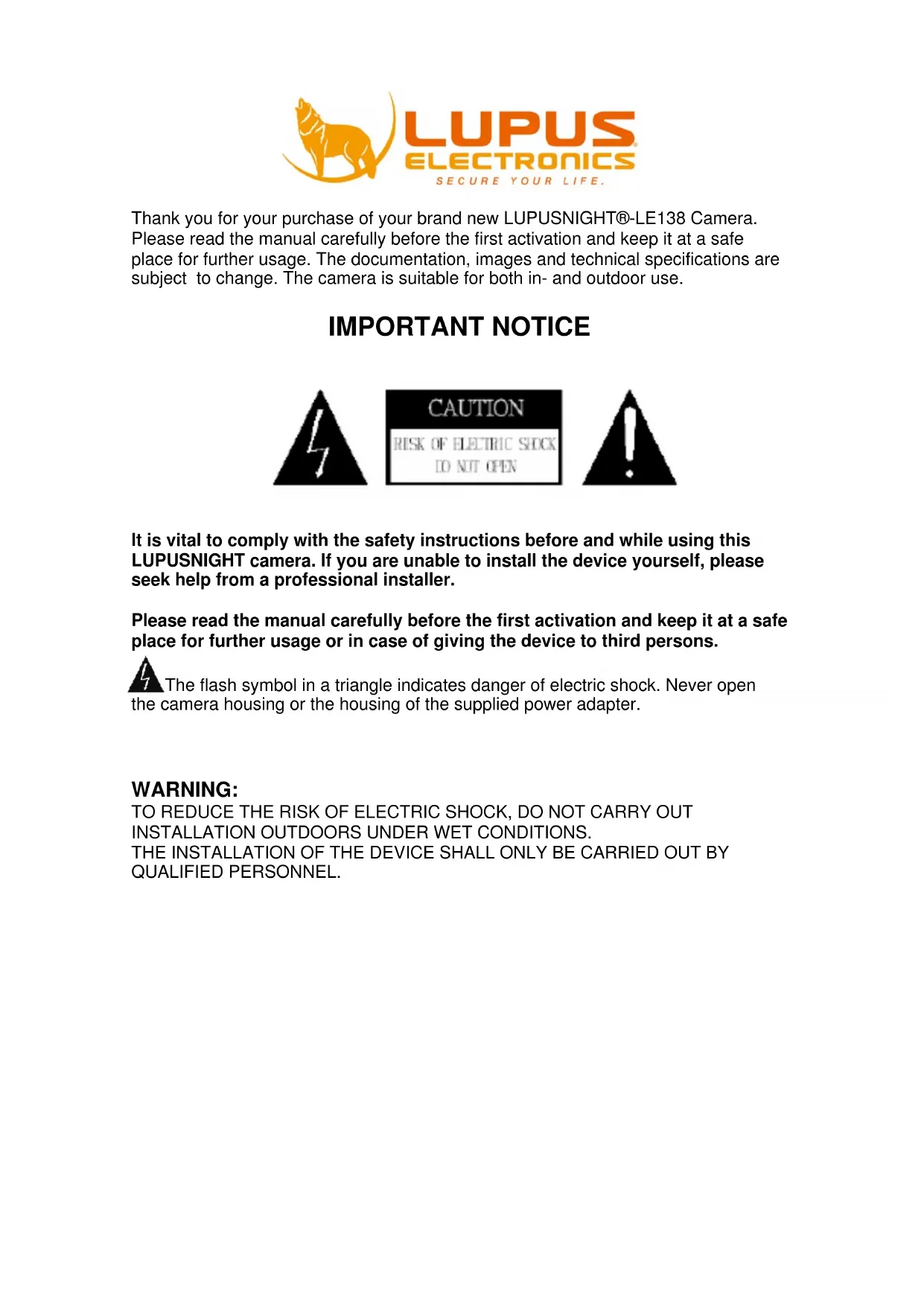 Thank you for your purchase of your brand new LUPUSNIGHT®-LE138 Camera. Please read the manual carefully before the first activation and keep it at a safe place for further usage. The documentation, images and technical specifications are subject to change. The camera is suitable for both in- and outdoor use.