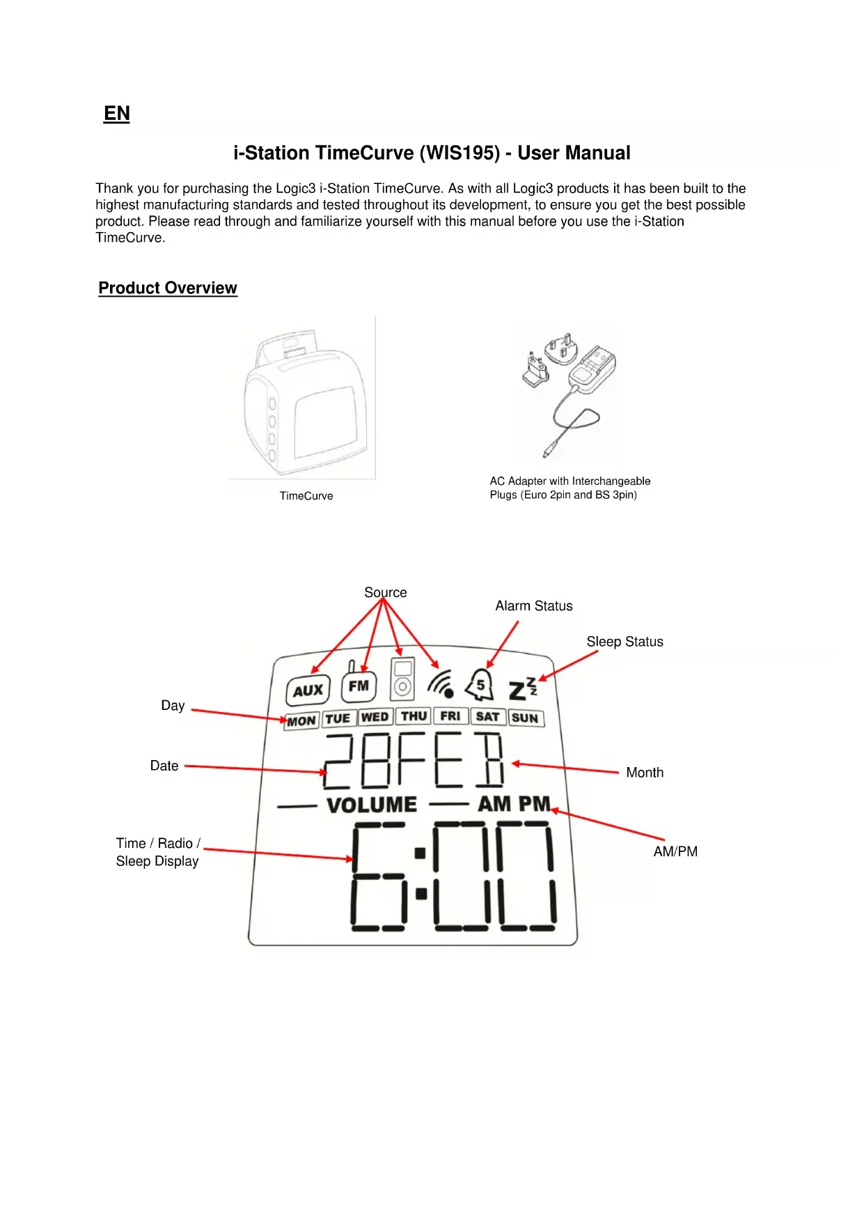 i-Station TimeCurve (WIS195) - User Manual Thank you for purchasing the Logic3 i-Station TimeCurve. As with all Logic3 products it has been built to the highest manufacturing standards and tested throughout its development, to ensure you get the best possible product. Please read through and familiarize yourself with this manual before you use the i-Station TimeCurve. Product Overview