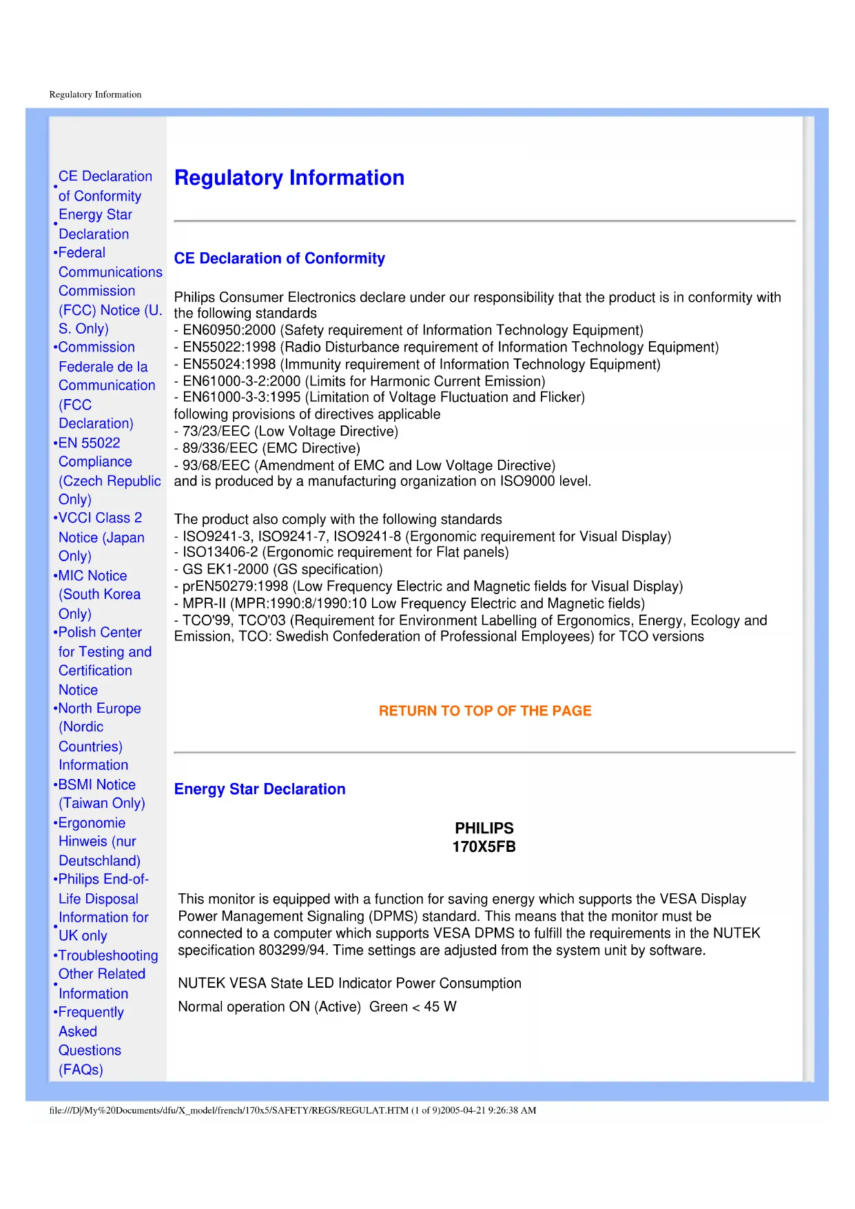 - Frequently Asked Questions (FAQs) Regulatory Information CE Declaration of Conformity Philips Consumer Electronics declare under our responsibility that the product is in conformity with the following standards - EN60950:2000 (Safety requirement of Information Technology Equipment) - EN55022:1998 (Radio Disturbance requirement of Information Technology Equipment) - EN55024:1998 (Immunity requirement of Information Technology Equipment) - EN61000-3-2:2000 (Limits for Harmonic Current Emission) - EN61000-3-3:1995 (Limitation of Voltage Fluctuation and Flicker) following provisions of directives applicable - 73/23/EEC (Low Voltage Directive) - 89/336/EEC (EMC Directive) - 93/68/EEC (Amendment of EMC and Low Voltage Directive) and is produced by a manufacturing organization on ISO9000 level. The product also comply with the following standards - ISO9241-3, ISO9241-7, ISO9241-8 (Ergonomic requirement for Visual Display) - ISO13406-2 (Ergonomic requirement for Flat panels) - GS EK1-2000 (GS specification) - prEN50279:1998 (Low Frequency Electric and Magnetic fields for Visual Display) - MPR-II (MPR:1990:8/1990:10 Low Frequency Electric and Magnetic fields) - TCO'99, TCO'03 (Requirement for Environment Labelling of Ergonomics, Energy, Ecology and Emission, TCO: Swedish Confederation of Professional Employees) for TCO versions