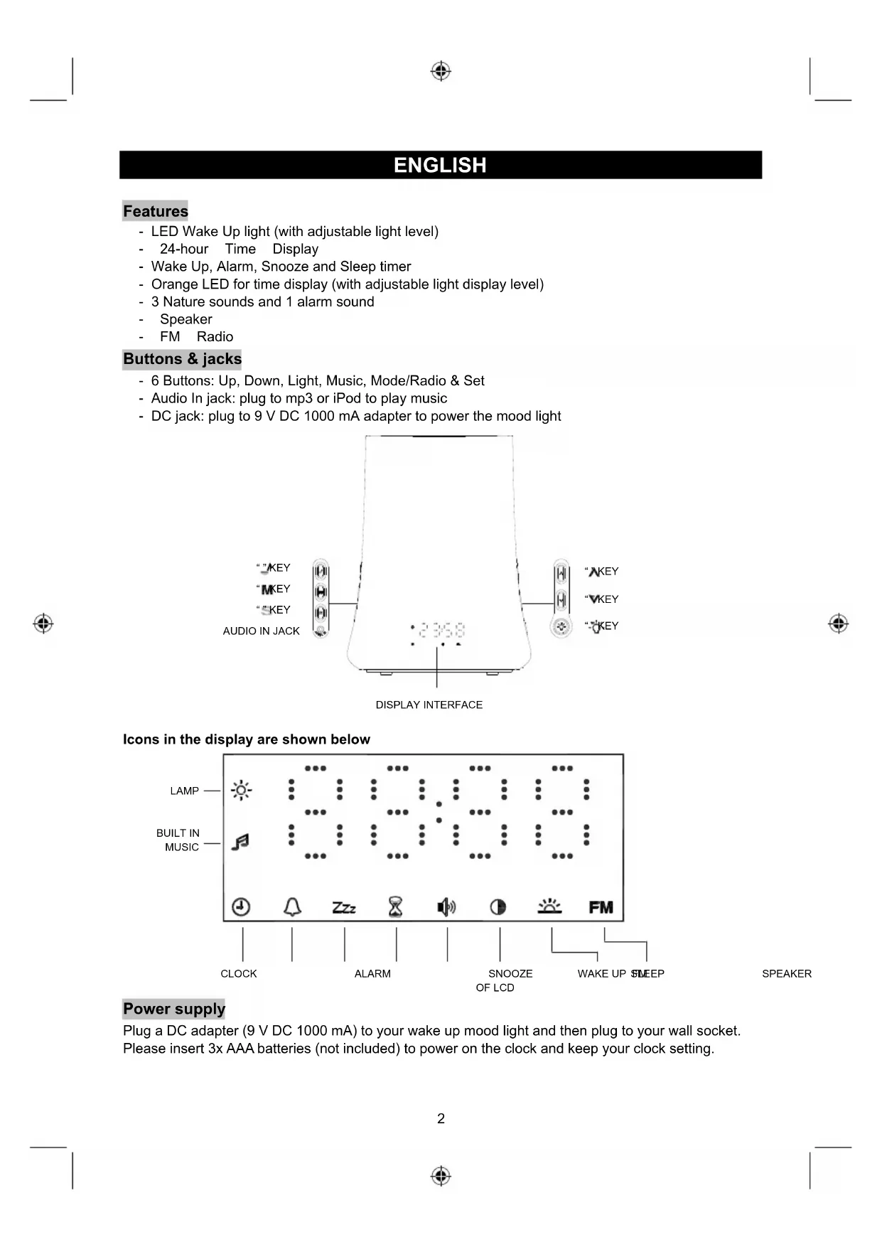 Power supply Plug a DC adapter (9 V DC 1000 mA) to your wake up mood light and then plug to your wall socket. Please insert 3x AAA batteries (not included) to power on the clock and keep your clock setting.3 Turning on the light Press the “ ” key to turn the light ON. The “ ” symbol is shown on the display. Press the “up” and “down” keys to adjust the light level, from level 01 to 20. Press the “ ” key again to turn the light OFF. Clock instructions When the mood light is plugged in using the DC adapter, the LED clock will appear on the lower part of the mood light. The time will show 0:00 to indicate that you have to set the clock time. How to set the clock time When 0:00 is shown on the display, start by pressing the “SET” key to enter time setting mode. The “ ” symbol is shown on the display, and the hour flashes. Press the “up” and “down” keys until you get to your desired hour, and then press the “SET” key again to set the minutes by pressing the “up” and “down” buttons. Press the “SET” key again to complete and save the setting. Remarks The display will return to normal time display by pressing the “MODE” key or by not pressing any key within 30 seconds. The hour can be set from 0 to 23, the minutes can be set from 0 to 59. How to set wake up alarm with snooze To set the wake up alarm, choose an alarm time, snooze period (from 5, 10, 15, 30 or 60 minutes) and the type of sound (3 nature sounds or 1 alarm sound) that you want to wake up to. The wake up alarm is set when the “ ” symbol is visible on the display. The light intensity of the lamp gradually increases to the set level in 20 minutes and the alarm sound gradually increases to the set level 2 minutes before the set wake-up time. When the unit is in clock mode, hold the “MODE” key until the “ ” symbol is shown on the display. Press the “SET” key to enter the wake up time settings and set in the order of: Hour→Minute→Music→Snooze time. Press the “up” and “down” keys to adjust to your desired setting. The hour can be set from 0 to 23, the minutes can be set from 0 to 59 and 3 nature sounds and 1 alarm sound can be selected. How to turn off the wake up alarm When the alarm goes off, press any key to switch off the alarm function and enter the snooze function. The light will be ON. When the snooze alarm goes off, press any key to switch off the snooze function. The snooze function can be activated 3 times. When the clock is in wake up time mode, press the “ ” key for 2 seconds to turn the wake up time on or off. When the clock is in clock time mode, press the “Set” key for 2 seconds to turn the snooze time on or off. Remarks The display will return to normal time display by pressing the “MODE” button or by not pressing any button within 30 seconds. The light brightness level and sound level for the wake up alarm is the same as your previous pre-set level. How to set the alarm time When the unit is in clock mode, hold the “MODE” key until the “ ” symbol is shown on the display. Press the “SET” key to enter the alarm time settings, and set in the order of: Hour→Minute→Music. Press the “up” and “down” keys to adjust to your desired setting. The hour can be set from 0 to 23, the minutes can be set from 0 to 59 and 3 nature sounds and 1 alarm sound can be selected.4 How to turn off the alarm When the alarm goes off, press any key to switch off the alarm function and enter the snooze function. The alarm will sound for 1 minute and the snooze function can be activated 3 times. When the clock is in alarm time mode, press the “ ” key for 2 seconds to turn the alarm time on or off. When the clock is in snooze mode, press the “Set” key for 2 seconds to turn the snooze time on or off. Remarks The display will return to normal time display by pressing the “MODE” button or by not pressing any button after 30 seconds. The alarm will not function if the alarm time is set within the wake up period. How to set the sleep timer To set the sleep timer, choose a sleep period (from 5, 15, 30 or 60 minutes) and the type of sound (3 nature sounds or 1 alarm sound) you want to set. The sleep timer is set when the “ ” symbol is visible on the display. The light intensity of the lamp gradually decreases until it fades and the alarm sound gradually decreases until it becomes silent after the sleep time. When the unit is in clock mode, hold the “MODE” key until the “ ” symbol is shown on the display. Press the “SET” key to enter the sleep time from: 00:05→00:15→00:30→00:45→1:00→Music. Press the “up” and “down” keys to adjust to your desired setting. 3 nature sounds and 1 alarm sound can be selected. How to turn off the sleep timer When the clock is in sleep timer mode, press the “ ” key for 2 seconds to turn the sleep timer on or off. Remarks The display will return to normal time display by pressing the “MODE” button or by not pressing any button after 30 seconds. The light brightness level and sound level for the sleep timer is the same as your previous pre-set level. The sleep timer will not function when the sleep time is set within the wake up period. If the light intensity or sound level is adjusted during the sleep time period, the light intensity or sound level will remain the same as the level upon setting. The timer will keep counting down. How to set the brightness of the LED digits When the unit is in clock mode, hold the “MODE” key until the “ ” symbol is shown on the display. Press the “SET” key to enter the setting mode. You can set 4 levels (from 1 to 4) for the brightness of the LED display by pressing the “up” and “down” keys to adjust to your desired setting. Remarks The display will return to normal time display by pressing the “MODE” button or by not pressing any button after 30 seconds. How to select the sleep sound Press the “ ” key and