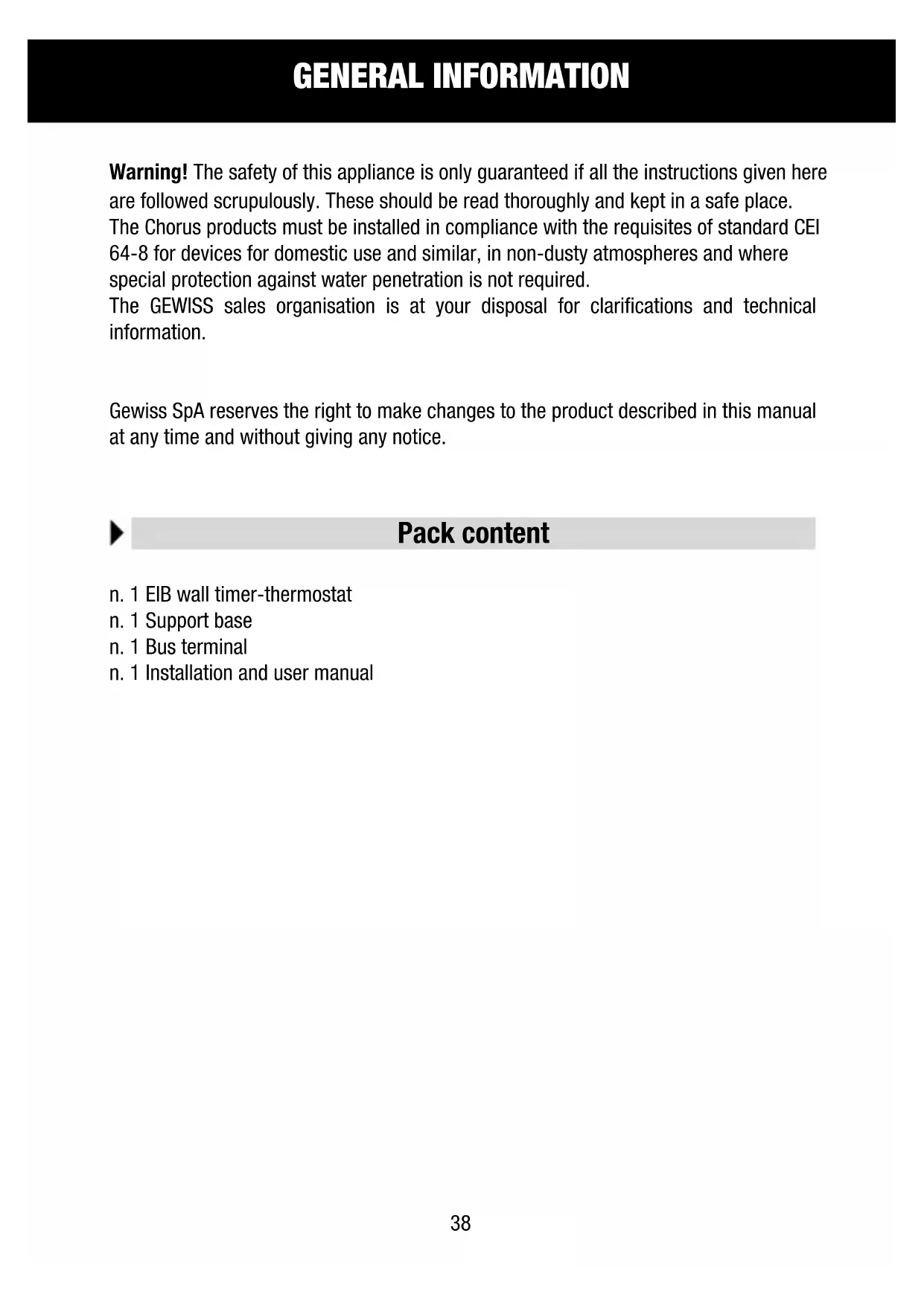 Warning! The safety of this appliance is only guaranteed if all the instructions given here are followed scrupulously. These should be read thoroughly and kept in a safe place. The Chorus products must be installed in compliance with the requisites of standard CEI 64-8 for devices for domestic use and similar, in non-dusty atmospheres and where special protection against water penetration is not required.