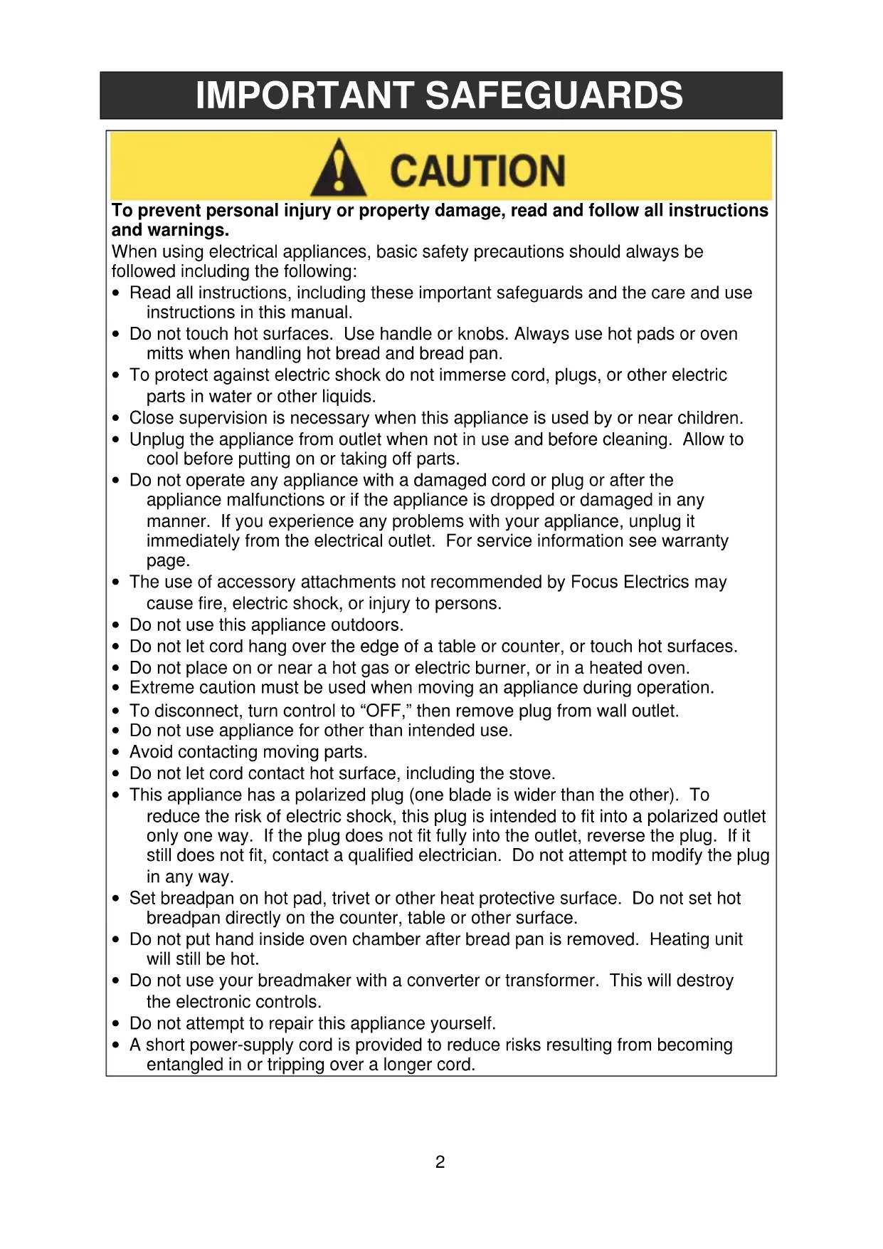 41400 - Bread maker Focus Electrics - Free user manual and instructions
