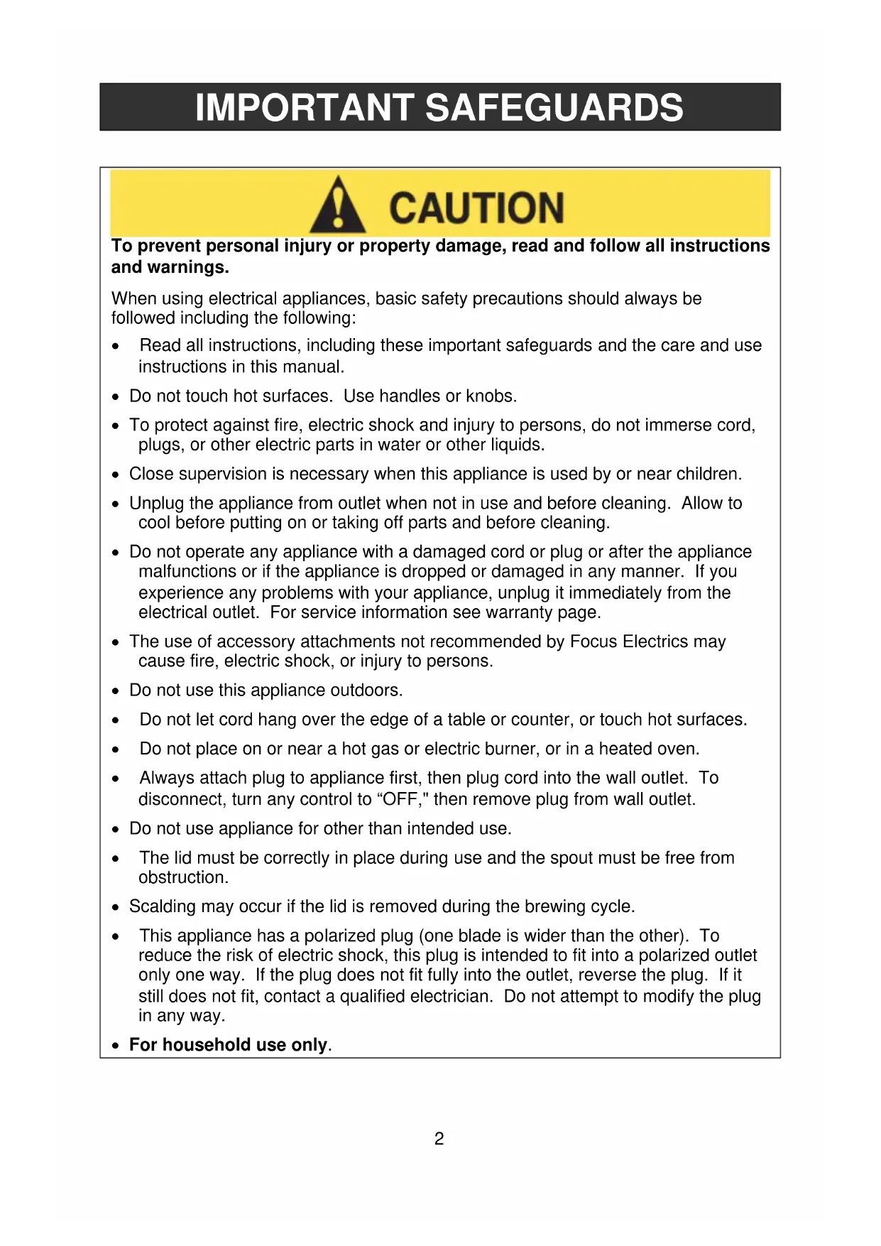 THIS WARRANTY IS IN LIEU OF ALL IMPLIED WARRANTYES, INCLUDING WARRANTYES OF MERCHANTABILITY, FITNESS FOR A PARTICULAR PURPOSE, PERFORMANCE, OR OTHERWISE, WHICH ARE HEREBY EXCUSED. IN NO EVENT SHALL FOCUS ELECTRICS BE LIABLE FOR ANY DAMAGES, WHETHER DIRECT, INDIRECT, INCIDENTAL, FORSEEABLE, CONSEQUENTIAL, OR SPECIAL, ARISING OUT OF OR IN CONNECTION WITH THIS APPLIANCE.