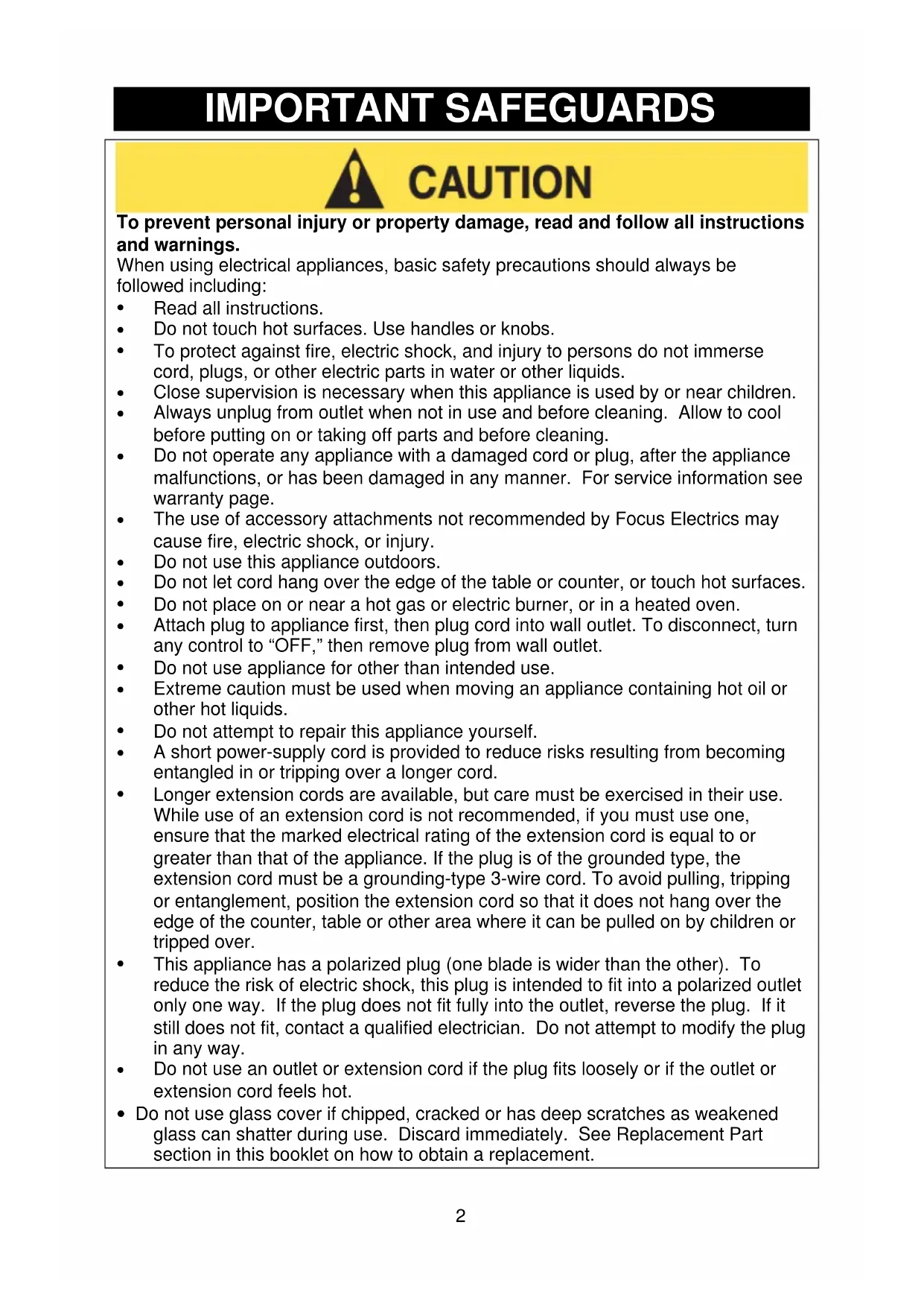 This warranty does not cover any damage, including discoloration, to any non-stick surface of the appliance. This warranty is null and void, as determined solely by Focus Electronics if the appliance is damaged through accident, misuse, abuse, negligence, scratching, or if the appliance is altered in any way.