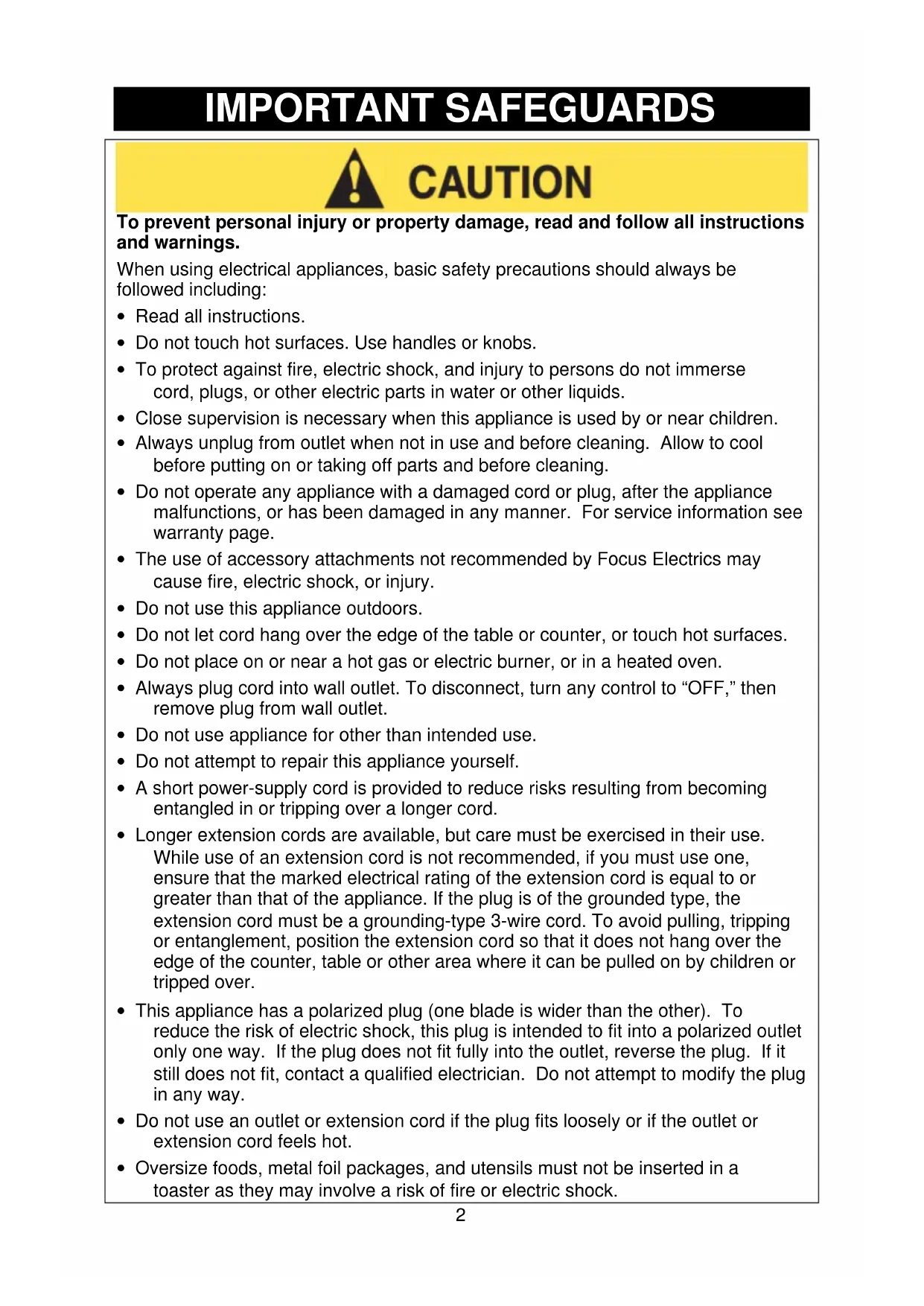 THIS WARRANTY IS IN LIEU OF ALL IMPLIED WARRANTYES, INCLUDING WARRANTYES OF MERCHANTABILITY, FITNESS FOR A PARTICULAR PURPOSE, PERFORMANCE, OR OTHERWISE, WHICH ARE HEREBY EXCUSED. IN NO EVENT SHALL FOCUS ELECTRICS BE LIABLE FOR ANY DAMAGES, WHETHER DIRECT, INDIRECT, INCIDENTAL, FORSEEABLE, CONSEQUENTIAL, OR SPECIAL, ARISING OUT OF OR IN CONNECTION WITH THIS APPLIANCE.