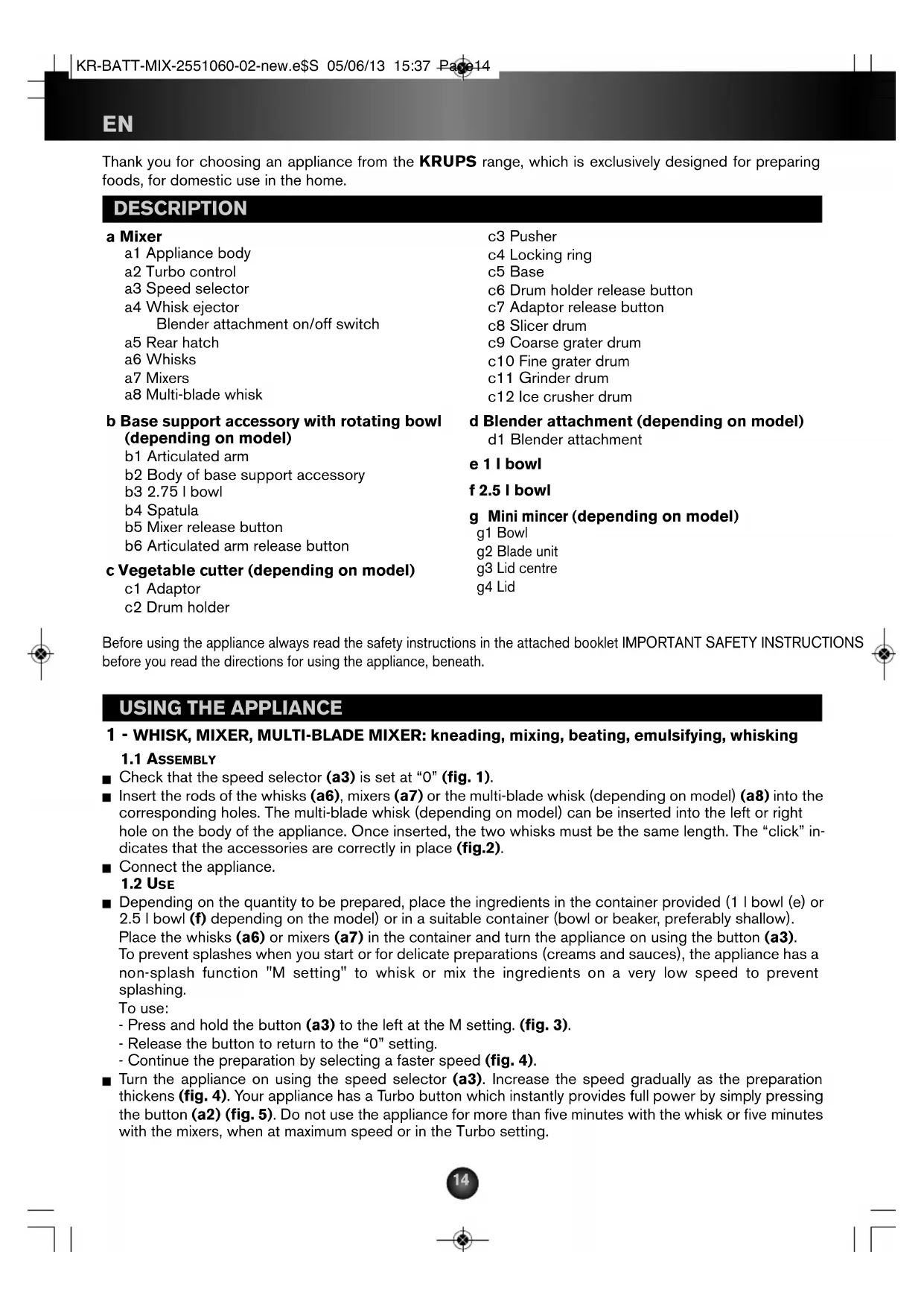 Thank you for choosing an appliance from the KRUPS range, which is exclusively designed for preparing foods, for domestic use in the home. DESCRIPTION a Mixer a1 Appliance body a2 Turbo control a3 Speed selector a4 Whisk ejector Blender attachment on/off switch a5 Rear hatch a6 Whisks a7 Mixers a8 Multi-blade whisk b Base support accessory with rotating bowl (depending on model) b1 Articulated arm b2 Body of base support accessory b3 2.75 l bowl b4 Spatula b5 Mixer release button b6 Articulated arm release button c Vegetable cutter (depending on model) c1 Adaptor c2 Drum holder c3 Pusher c4 Locking ring c5 Base c6 Drum holder release button c7 Adaptor release button c8 Slicer drum c9 Coarse grater drum c10 Fine grater drum c11 Grinder drum c12 Ice crusher drum d Blender attachment (depending on model) d1 Blender attachment e 1 l bowl f 2.5 l bowl