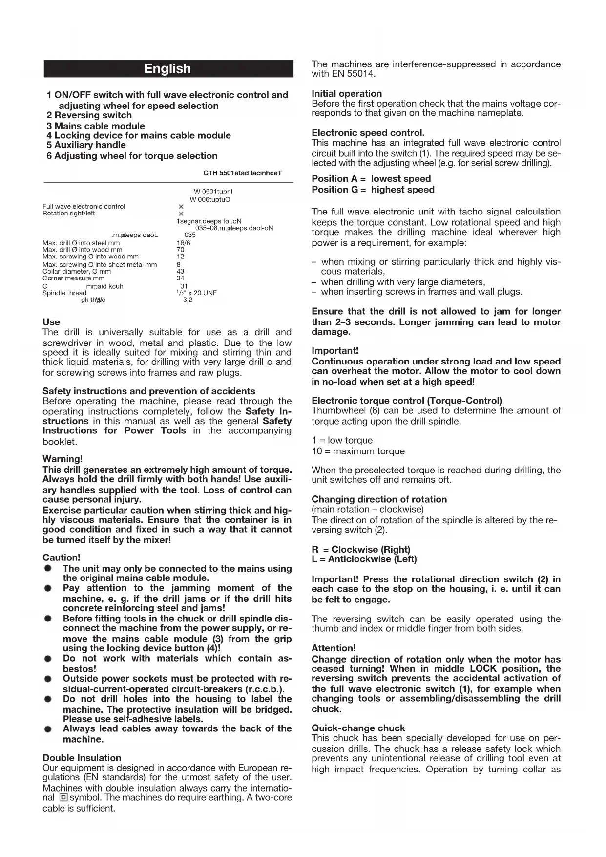 /2" x 20 UNF 3,2gk thgieW Use The drill is universally suitable for use as a drill and screwdriver in wood, metal and plastic. Due to the low speed it is ideally suited for mixing and stirring thin and thick liquid materials, for drilling with very large drill ø and for screwing screws into frames and raw plugs. Safety instructions and prevention of accidents Before operating the machine, please read through the operating instructions completely, follow the Safety In- structions in this manual as well as the general Safety Instructions for Power Tools in the accompanying booklet. Warning! This drill generates an extremely high amount of torque. Always hold the drill firmly with both hands! Use auxili- ary handles supplied with the tool. Loss of control can cause personal injury. Exercise particular caution when stirring thick and hig- hly viscous materials. Ensure that the container is in good condition and fixed in such a way that it cannot be turned itself by the mixer! Caution! The unit may only be connected to the mains using the original mains cable module. Pay attention to the jamming moment of the machine, e. g. if the drill jams or if the drill hits concrete reinforcing steel and jams! Before fitting tools in the chuck or drill spindle dis- connect the machine from the power supply, or re- move the mains cable module (3) from the grip using the locking device button (4)! Do not work with materials which contain as- bestos! Outside power sockets must be protected with re- sidual-current-operated circuit-breakers (r.c.c.b.). Do not drill holes into the housing to label the machine. The protective insulation will be bridged. Please use self-adhesive labels. Always lead cables away towards the back of the machine. Double Insulation Our equipment is designed in accordance with European re- gulations (EN standards) for the utmost safety of the user. Machines with double insulation always carry the internatio- nal symbol. The machines do require earthing. A two-core cable is sufficient. The machines are interference-suppressed in accordance with EN 55014. Initial operation Before the first operation check that the mains voltage cor- responds to that given on the machine nameplate. Electronic speed control. This machine has an integrated full wave electronic control circuit built into the switch (1). The required speed may be se- lected with the adjusting wheel (e.g. for serial screw drilling). Position A = lowest speed Position G = highest speed The full wave electronic unit with tacho signal calculation keeps the torque constant. Low rotational speed and high torque makes the drilling machine ideal wherever high power is a requirement, for example: – when mixing or stirring particularly thick and highly vis- cous materials, – when drilling with very large diameters, – when inserting screws in frames and wall plugs. Ensure that the drill is not allowed to jam for longer than 2–3 seconds. Longer jamming can lead to motor damage. Important! Continuous operation under strong load and low speed can overheat the motor. Allow the motor to cool down in no-load when set at a high speed! Electronic torque control (Torque-Control) Thumbwheel (6) can be used to determine the amount of torque acting upon the drill spindle. 1 = low torque 10 = maximum torque When the preselected torque is reached during drilling, the unit switches off and remains oft. Changing direction of rotation (main rotation – clockwise) The direction of rotation of the spindle is altered by the re- versing switch (2). R = Clockwise (Right) L = Anticlockwise (Left) Important! Press the rotational direction switch (2) in each case to the stop on the housing, i. e. until it can be felt to engage. The reversing switch can be easily operated using the thumb and index or middle finger from both sides. Attention! Change direction of rotation only when the motor has ceased turning! When in middle LOCK position, the reversing switch prevents the accidental activation of the full wave electronic switch (1), for example when changing tools or assembling/disassembling the drill chuck. Quick-change chuck This chuck has been specially developed for use on per- cussion drills. The chuck has a release safety lock which prevents any unintentional release of drilling tool even at high impact frequencies. Operation by turning collar asusual to stop point. Engagement of clamping force safety lock for subsequent operation is clearly heard and felt. Clamping and releasing of chuck by holding the locking ring. If a faulty chuck has to be replaced, please check whether the chuck is secured to the drill spindle with a safety screw. This screw must be removed first (Caution! Lefthan- ded screw! Turn clockwise!). Screw off the drill chuck as shown in the picture (with an open-end wrench). For reassembly, proceed in the opposite direction. Caution: Before fitting a new chuck please clean the end faces on the chuck and drill spindle. Tighten the new chuck securely (30 Nm). Secure the chuck with the safety screw is there is one (Tighten the safety screw in anti-clockwise direction). Caution! It is still possible, especially when there is no safety screw, that the chuck comes off the drill spindle when it is turning in the anticlockwise direction. For this rea- son, when changing the chuck ensure that it is fitted onto the spindle perfectly. Caution! Put the reversing switch (2) in the LOCK position be- fore disassembling and reassembling the drill chuck, disconnect the machine from the power supply, or re- move the mains cable module (3) from the grip using the locking device button (4). Always make sure that the chosen speed is correct for the purpose for which you are using the machine. When drilling match speed with type of material and drill. Use tool steel twist drills for soft materials such as wood and plastics; high speed twist drills for steel and iron. When drilling match speed to material and the diameter of the drill. Use tool steel 