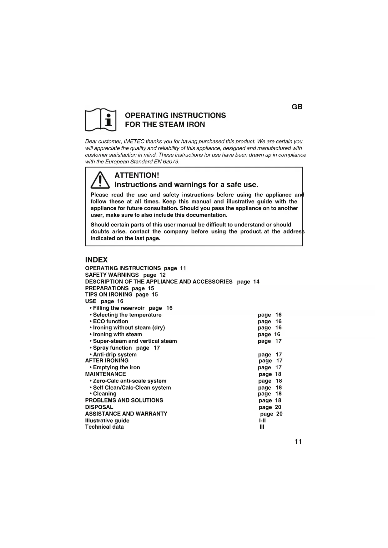 10GB OPERATING INSTRUCTIONS FOR THE STEAM IRON Dear customer, IMETEC thanks you for having purchased this product. We are certain you