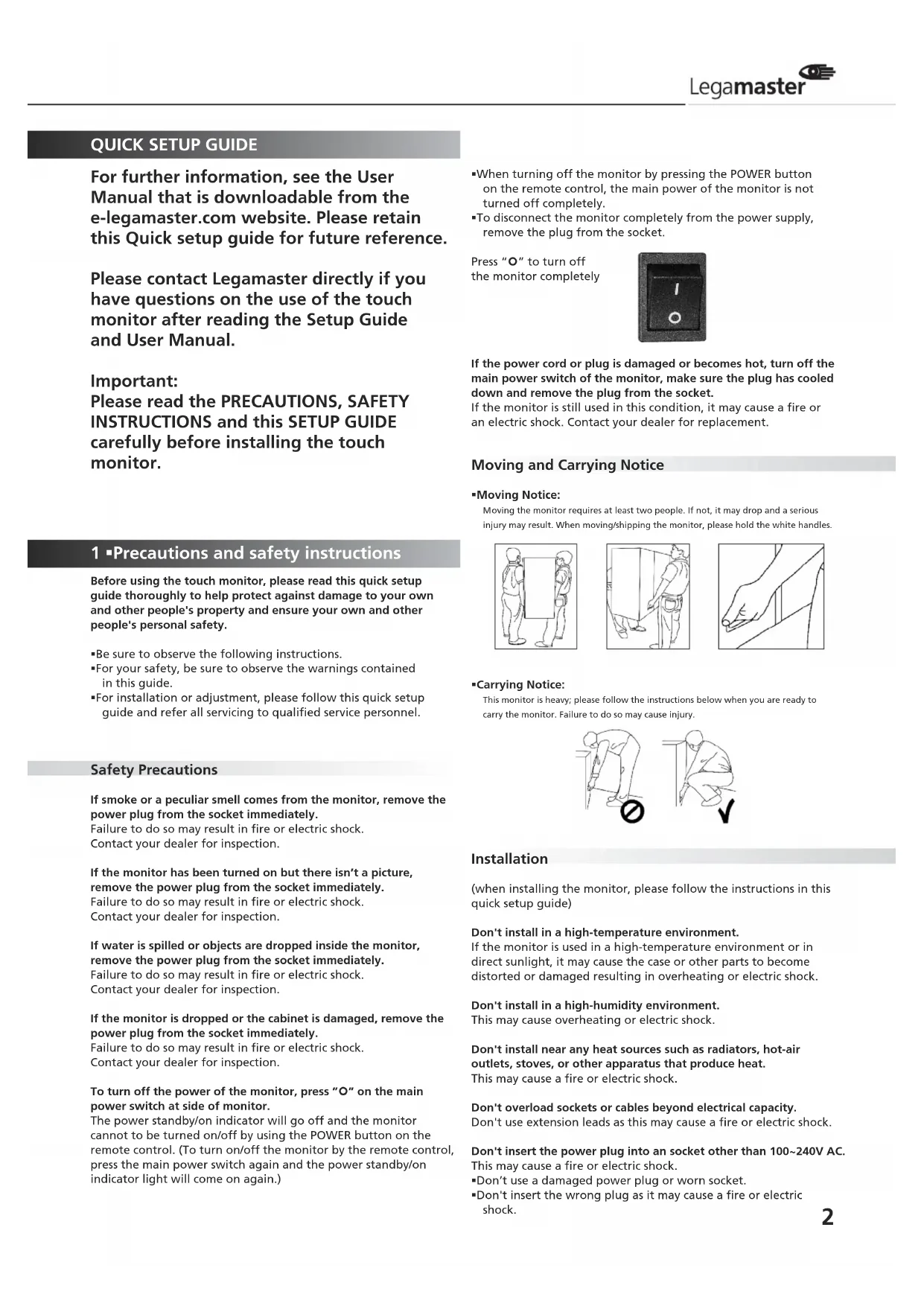 PROFESSIONAL e-Screen 55" ETD E N G L I S H D E U T S C H F R A N Ç A I S NEDERLANDS T U R K I S H2 For further information, see the User Manual that is downloadable from the e-legamaster.com website. Please retain this Quick setup guide for future reference. Please contact Legamaster directly if you have questions on the use of the touch monitor after reading the Setup Guide and User Manual. Important: Please read the PRECAUTIONS, SAFETY INSTRUCTIONS and this SETUP GUIDE carefully before installing the touch monitor. Before using the touch monitor, please read this quick setup guide thoroughly to help protect against damage to your own and other people's property and ensure your own and other people's personal safety. Be sure to observe the following instructions. For your safety, be sure to observe the warnings contained in this guide. For installation or adjustment, please follow this quick setup guide and refer all servicing to qualified service personnel. Safety Precautions If smoke or a peculiar smell comes from the monitor, remove the power plug from the socket immediately. Failure to do so may result in fire or electric shock. Contact your dealer for inspection. If the monitor has been turned on but there isn’t a picture, remove the power plug from the socket immediately. Failure to do so may result in fire or electric shock. Contact your dealer for inspection. If water is spilled or objects are dropped inside the monitor, remove the power plug from the socket immediately. Failure to do so may result in fire or electric shock. Contact your dealer for inspection. If the monitor is dropped or the cabinet is damaged, remove the power plug from the socket immediately. Failure to do so may result in fire or electric shock. Contact your dealer for inspection. To turn off the power of the monitor, press ”” on the main power switch at side of monitor. The power standby/on indicator will go off and the monitor cannot to be turned on/off by using the POWER button on the remote control. (To turn on/off the monitor by the remote control, press the main power switch again and the power standby/on indicator light will come on again.) When turning off the monitor by pressing the POWER button on the remote control, the main power of the monitor is not turned off completely. To disconnect the monitor completely from the power supply, remove the plug from the socket. Press “” to turn off the monitor completely If the power cord or plug is damaged or becomes hot, turn off the main power switch of the monitor, make sure the plug has cooled down and remove the plug from the socket. If the monitor is still used in this condition, it may cause a fire or an electric shock. Contact your dealer for replacement. Moving and Carrying Notice Moving Notice: