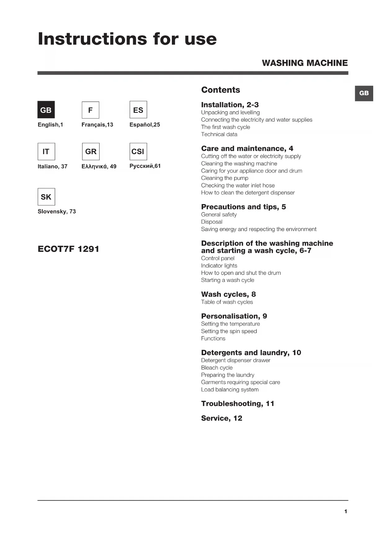 Contents Installation, 2-3 Unpacking and levelling Connecting the electricity and water supplies The first wash cycle Technical data Care and maintenance, 4 Cutting off the water or electricity supply Cleaning the washing machine Caring for your appliance door and drum Cleaning the pump Checking the water inlet hose How to clean the detergent dispenser Precautions and tips, 5 General safety Disposal Saving energy and respecting the environment Description of the washing machine and starting a wash cycle, 6-7 Control panel Indicator lights How to open and shut the drum Starting a wash cycle Wash cycles, 8 Table of wash cycles Personalisation, 9 Setting the temperature Setting the spin speed Functions Detergents and laundry, 10 Detergent dispenser drawer Bleach cycle Preparing the laundry Garments requiring special care Load balancing system Troubleshooting, 11 Service, 12 ECOT7F 1291 Instructions for use WASHING MACHINE English,1
