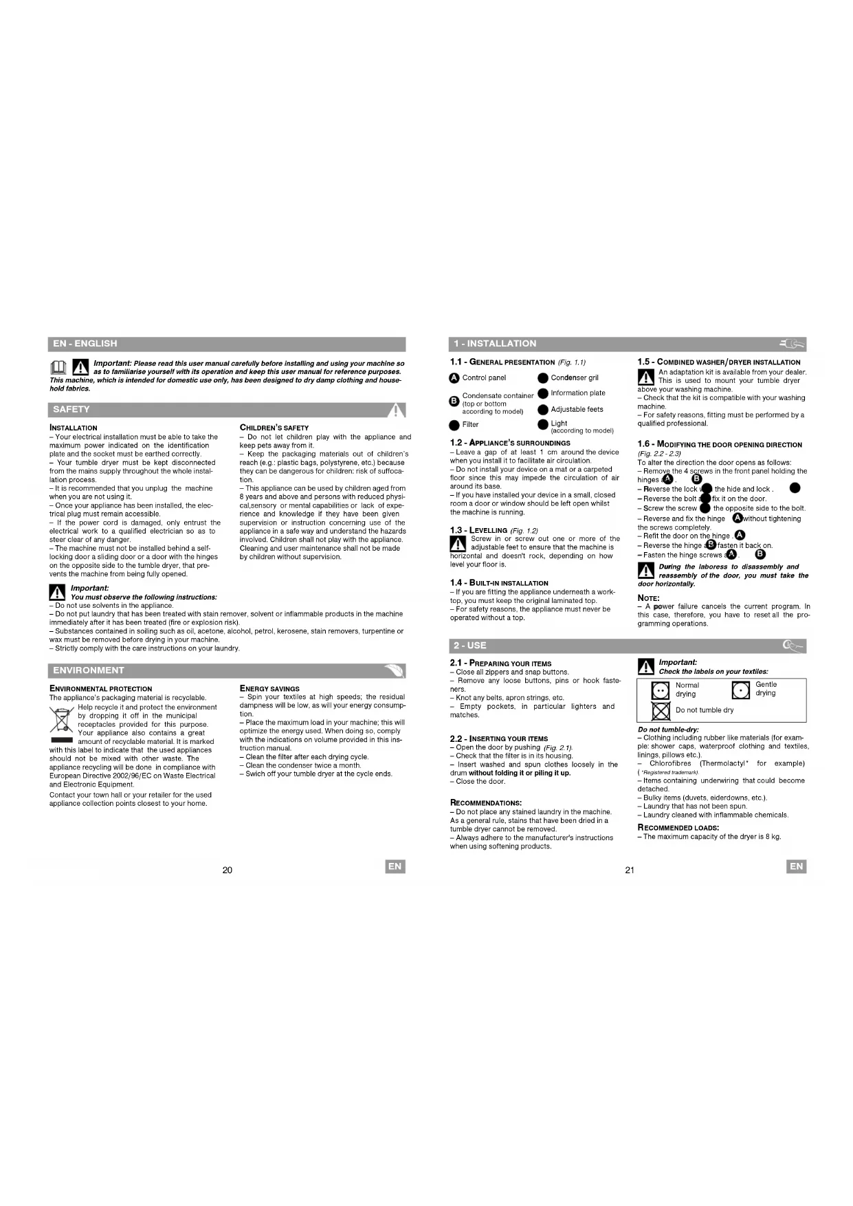 R ECOMMENDED LOADS: — The maximum capacity of the dryer is 8 kg.