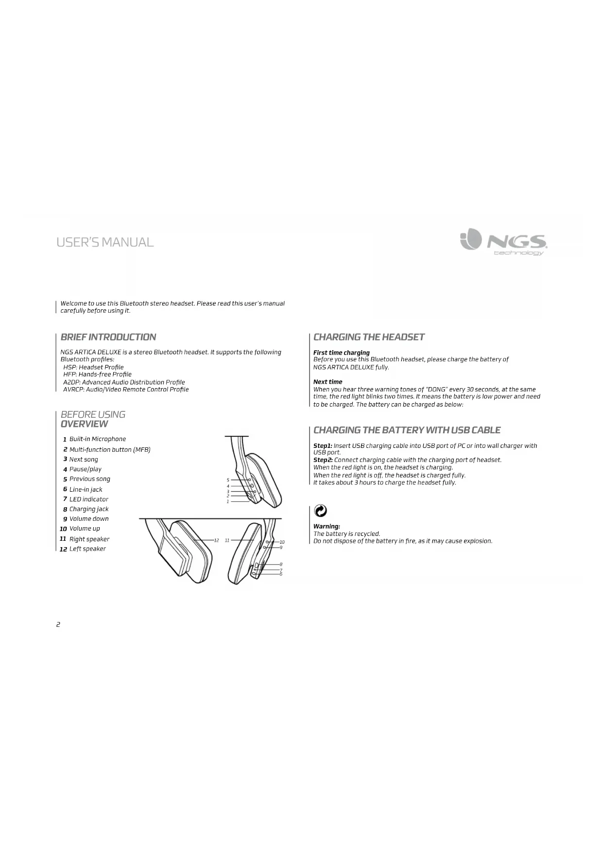 BRIEF INTRODUCTION NGS ARTICA DELUXE is a stereo Bluetooth headset. It supports the following